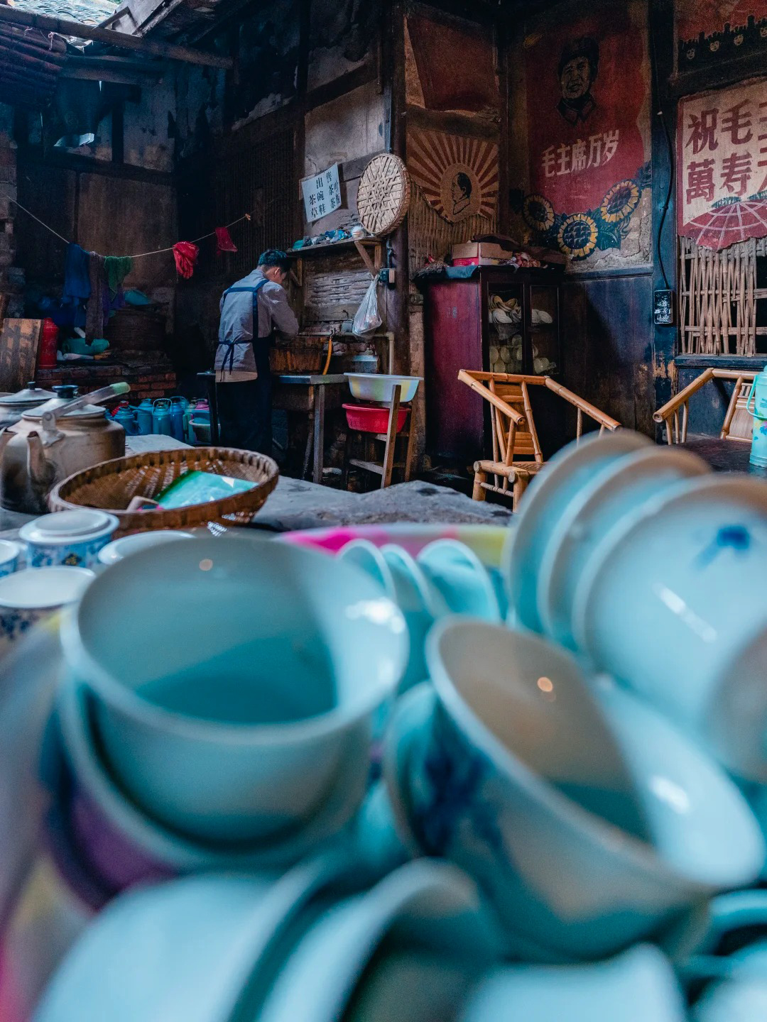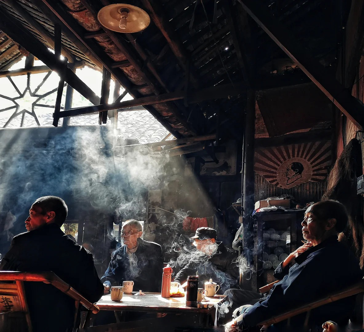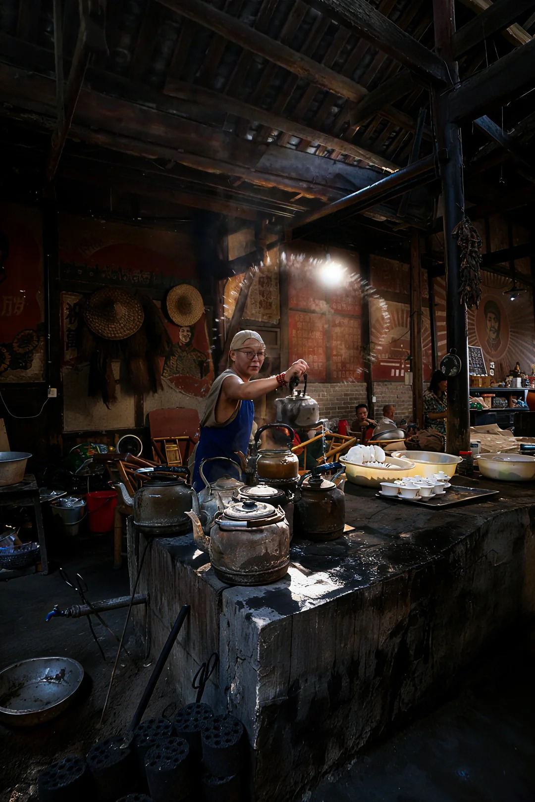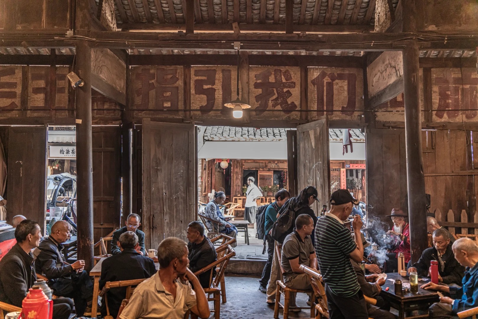 位于成都市双流区的彭镇,其百年老茶馆是摄影爱好者心中的“人文摄影圣地”。这里最大限度地保留了清末民初的样貌:千脚泥地面、斑驳的墙体、老旧的竹椅和蜂窝煤炉上永远沸腾的铝壶。清晨,光线透过天窗瓦隙照射进来,与水蒸气、茶客的烟氲形成绝妙的光影效果。我们将在此拍摄最富市井烟火气的画面,捕捉老茶客们悠闲自得的神情与状态,是练习环境人像与纪实摄影的绝佳课堂。