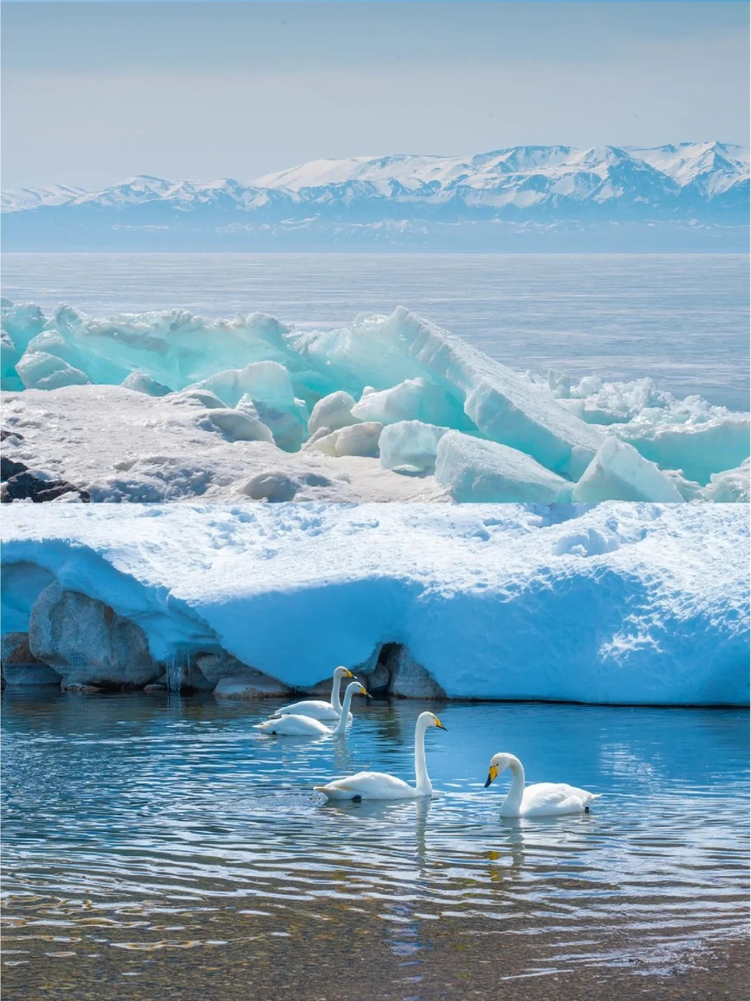 双湖冰雪与生灵对话:捕捉赛里木湖的“蓝冰”奇观和天鹅泉湿地晨雾中优雅的天鹅,同时领略冬季冰雪覆盖的草原景色。