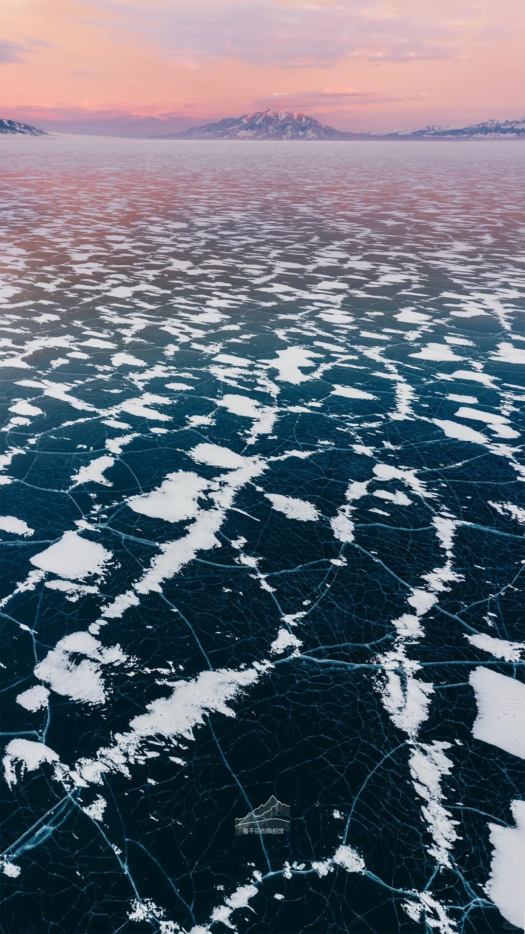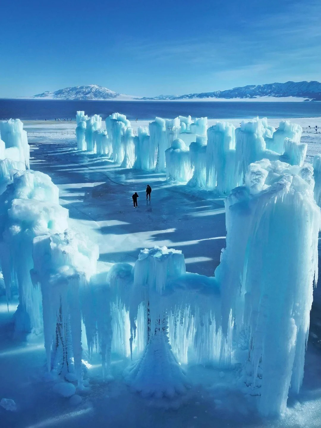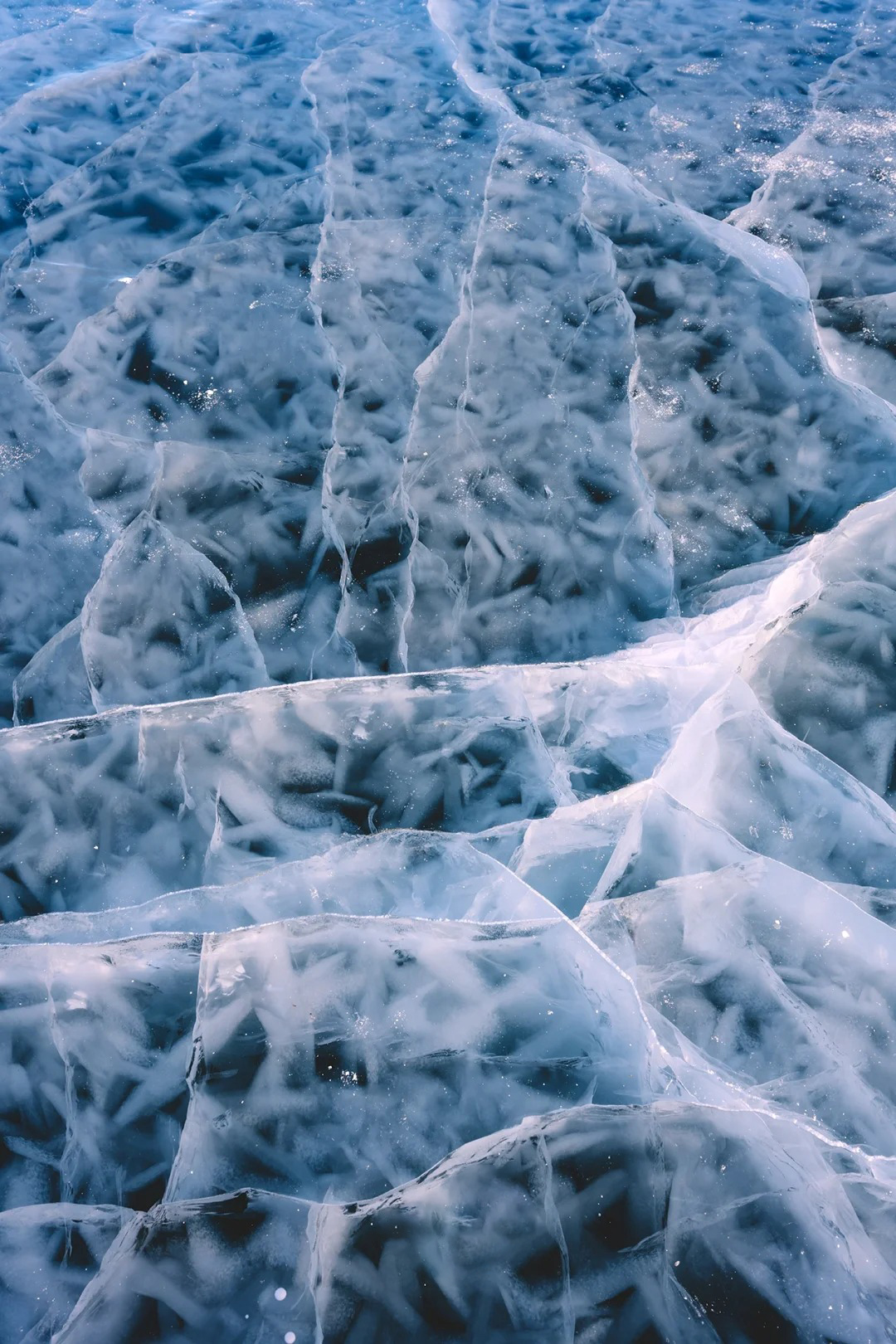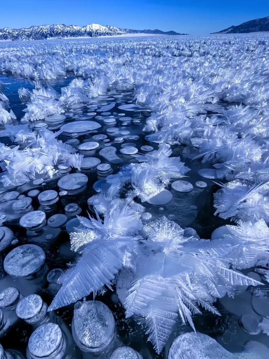 赛里木湖蓝冰:冬季的赛里木湖,湖水凝结成冰,湖面呈现出深邃的蓝色,宛如“大西洋的最后一滴眼泪”。可拍摄冰泡、冰裂等奇特景观。结合远处的雪山,构图力求简洁。