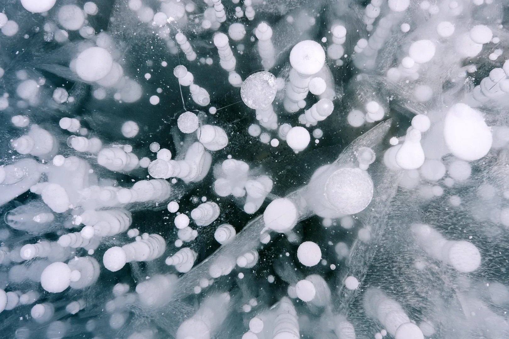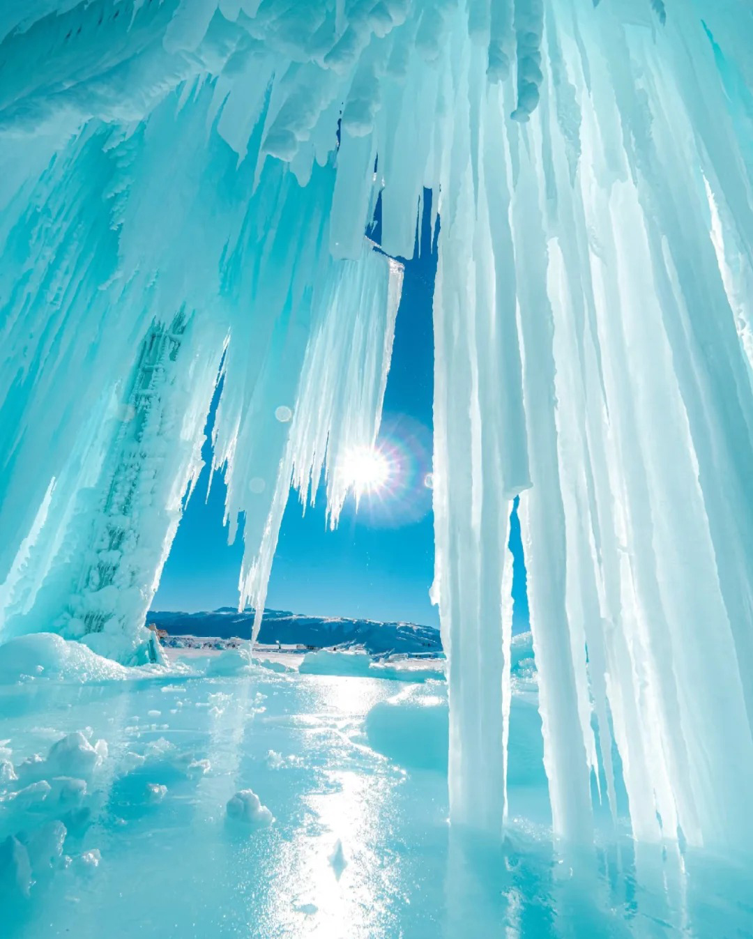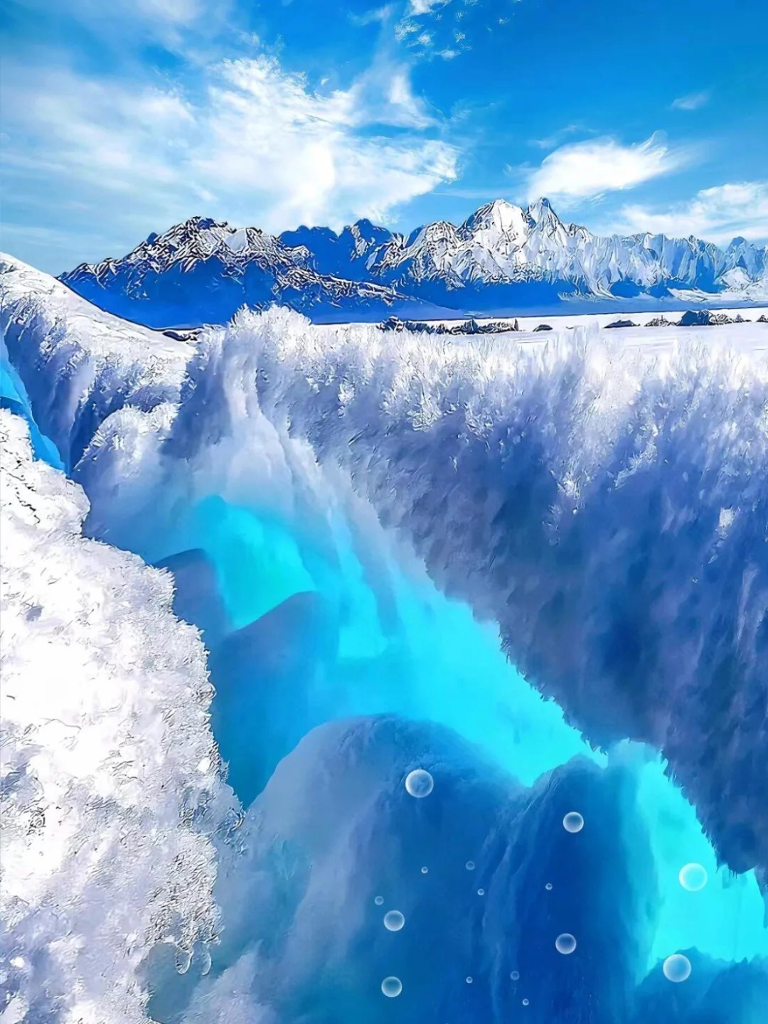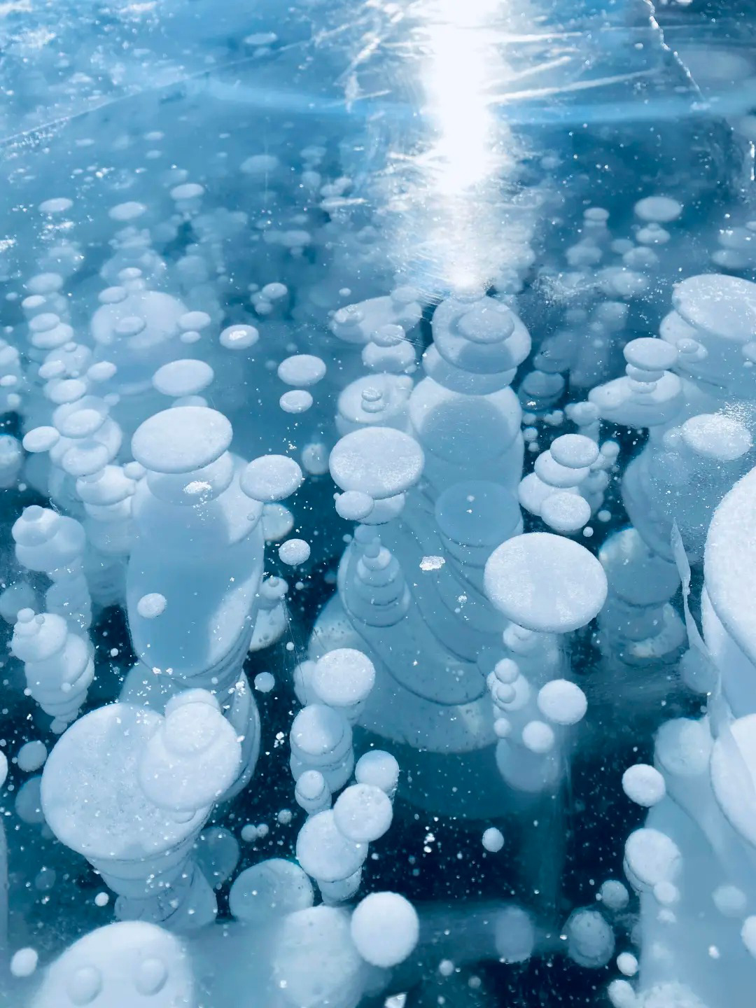 赛里木湖蓝冰:冬季的赛里木湖,湖水凝结成冰,湖面呈现出深邃的蓝色,宛如“大西洋的最后一滴眼泪”。可拍摄冰泡、冰裂等奇特景观。结合远处的雪山,构图力求简洁。