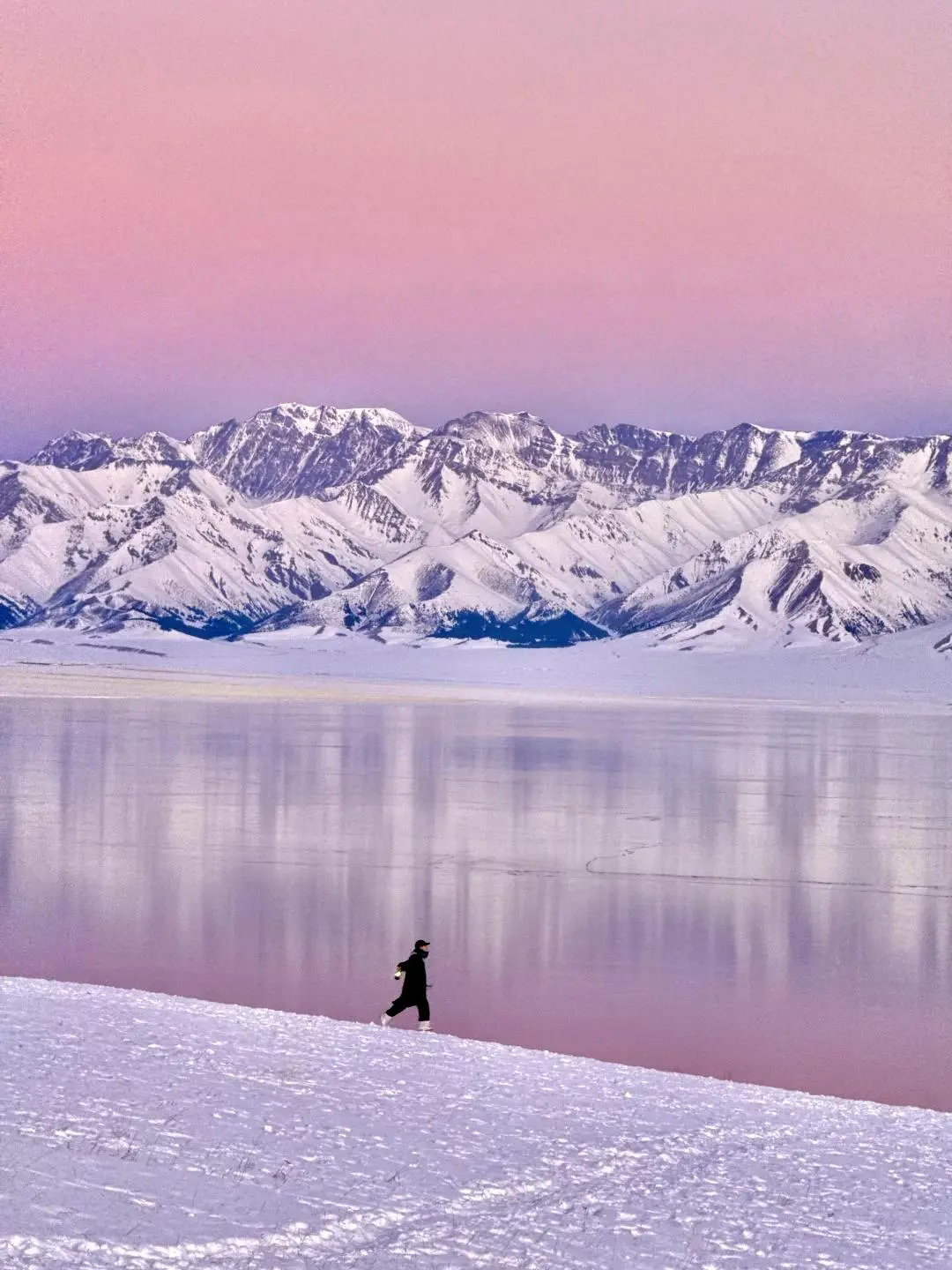 当冬季的严寒笼罩大地,新疆赛里木湖褪去了夏日的喧嚣与秋日的斑斓,换上了一袭冰封的银装,化身为一个静谧而壮美的冰雪仙境。