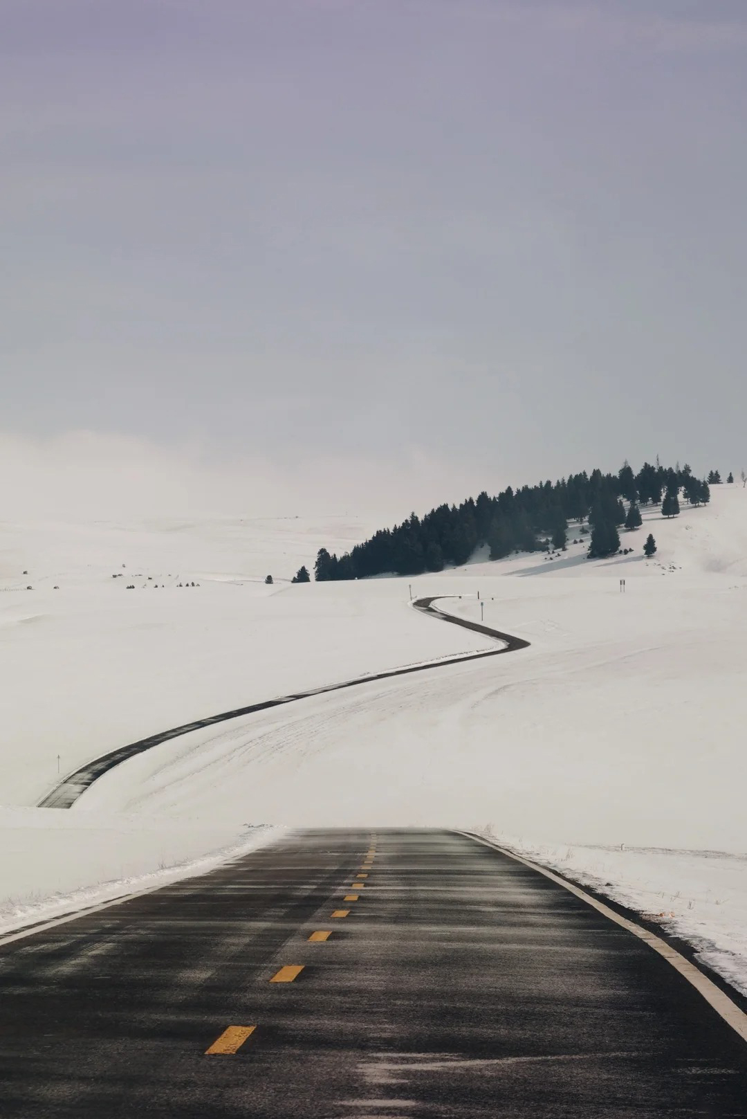 它不再是游客如织的“空中花园”,而是回归成了一个苍茫、原始、充满野性之美的雪域荒原。褪去所有色彩,广袤的草原与森林被厚厚的白雪覆盖,只剩下黑、白、灰的纯粹色调。
