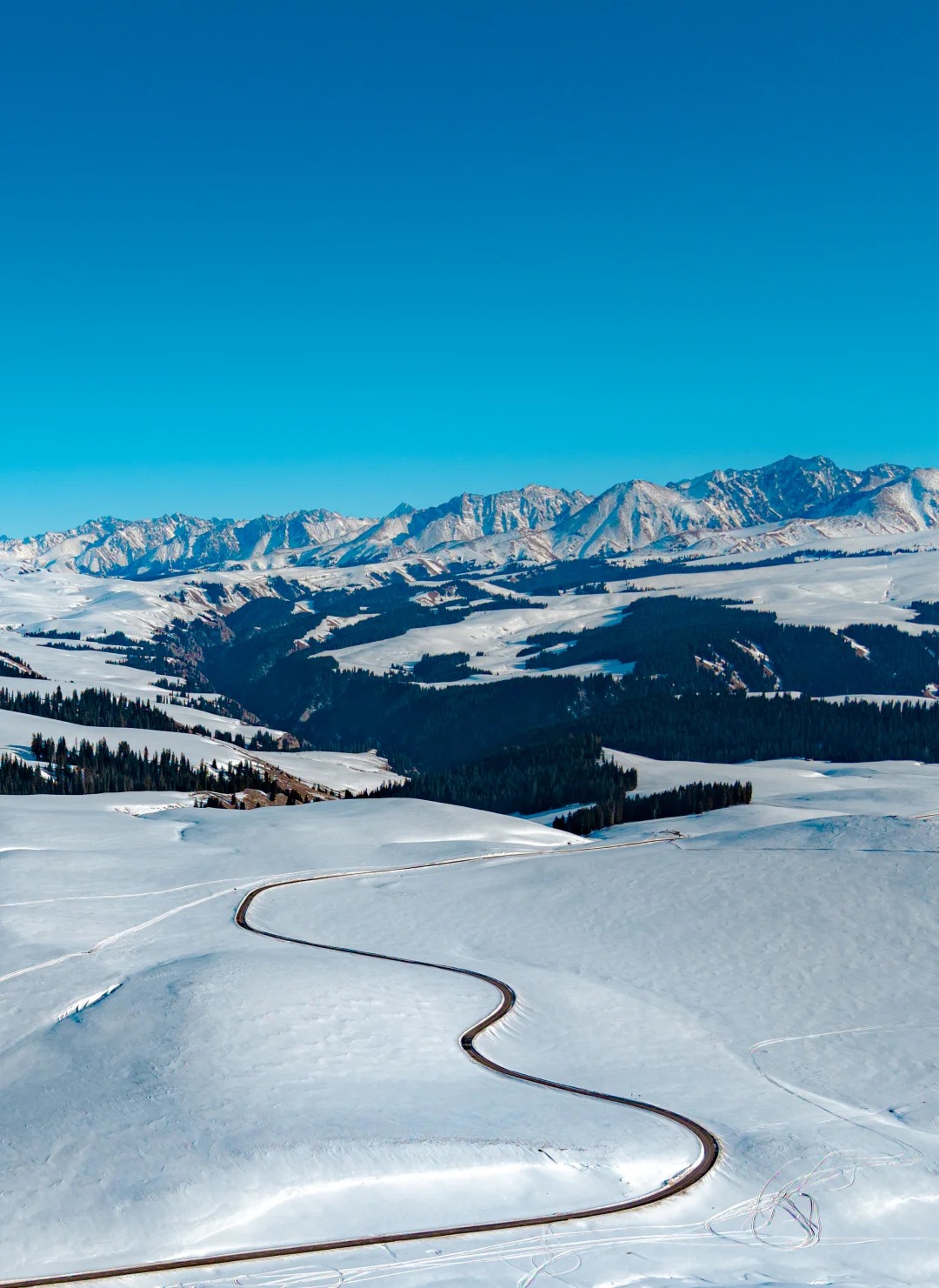 雪原风光:冬季的喀拉峻草原被白雪覆盖,起伏的曲线在低角度光线下的光影效果极佳。