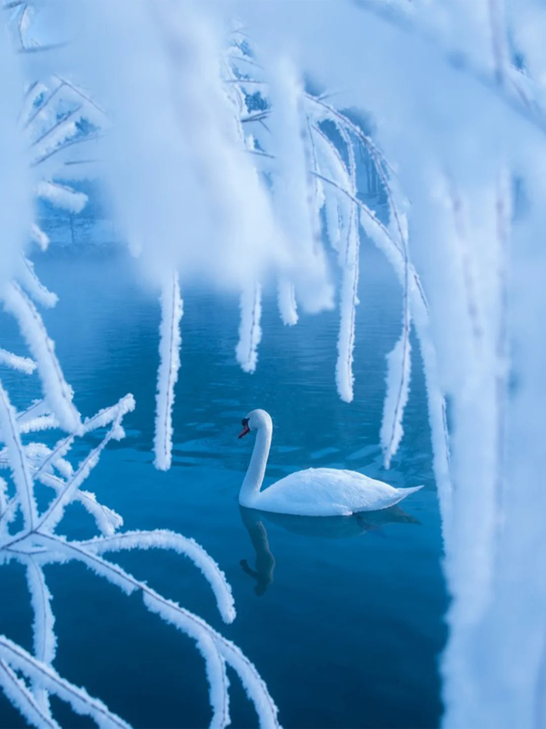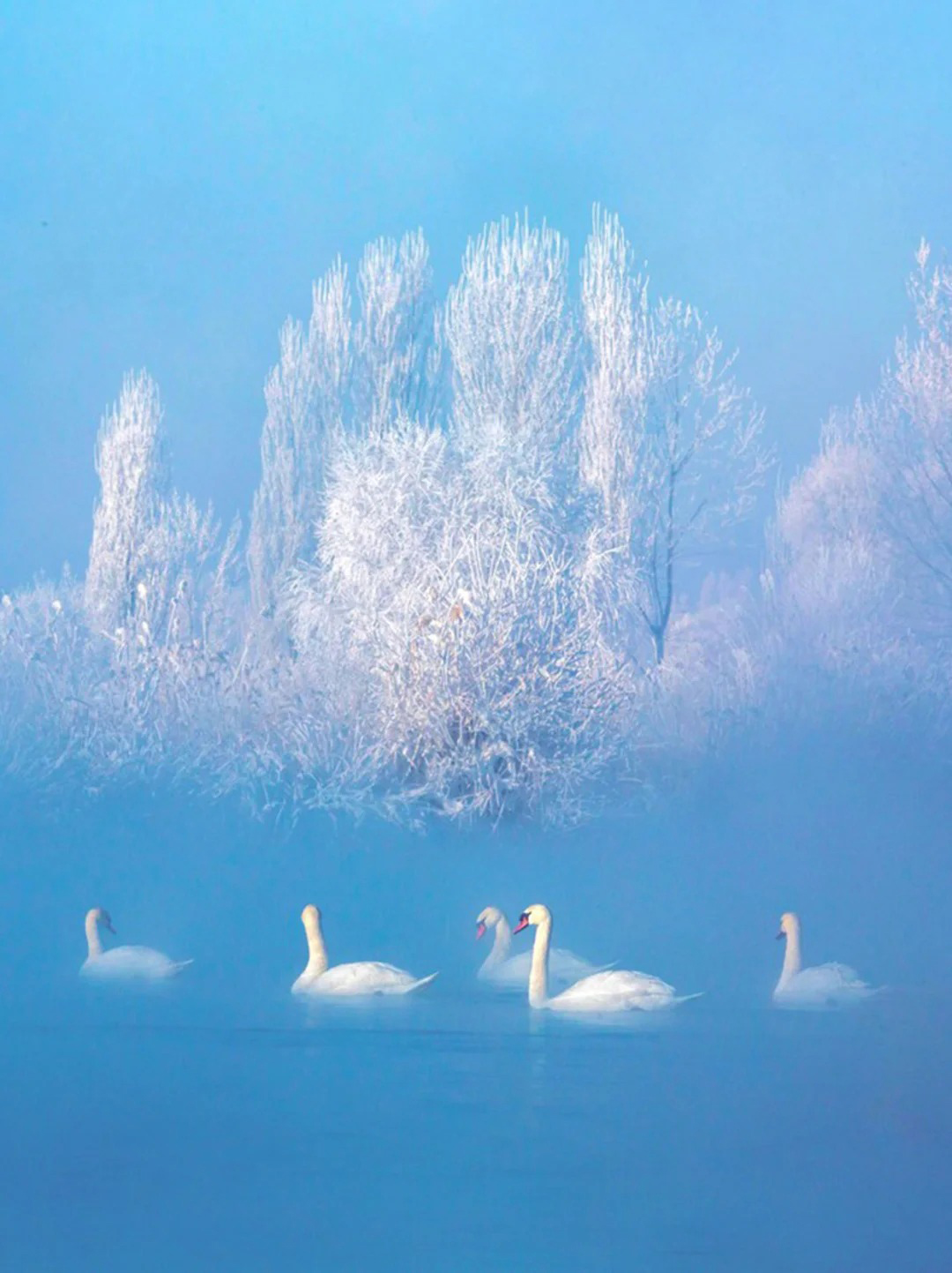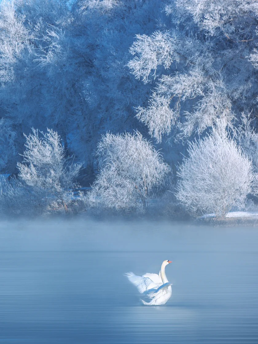 每日清晨是奇迹发生的时刻,蒸腾的水汽在冷冽的空气中凝华,为湖畔的树木披上晶莹洁白的雾凇,构成一幅蓝白交织的纯净背景。