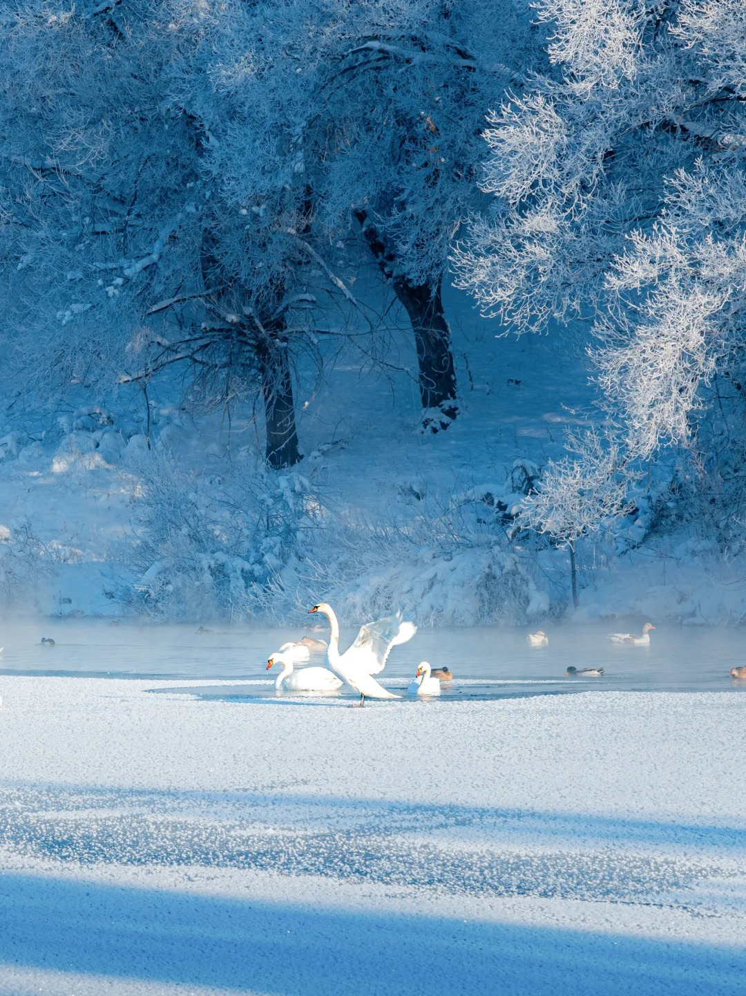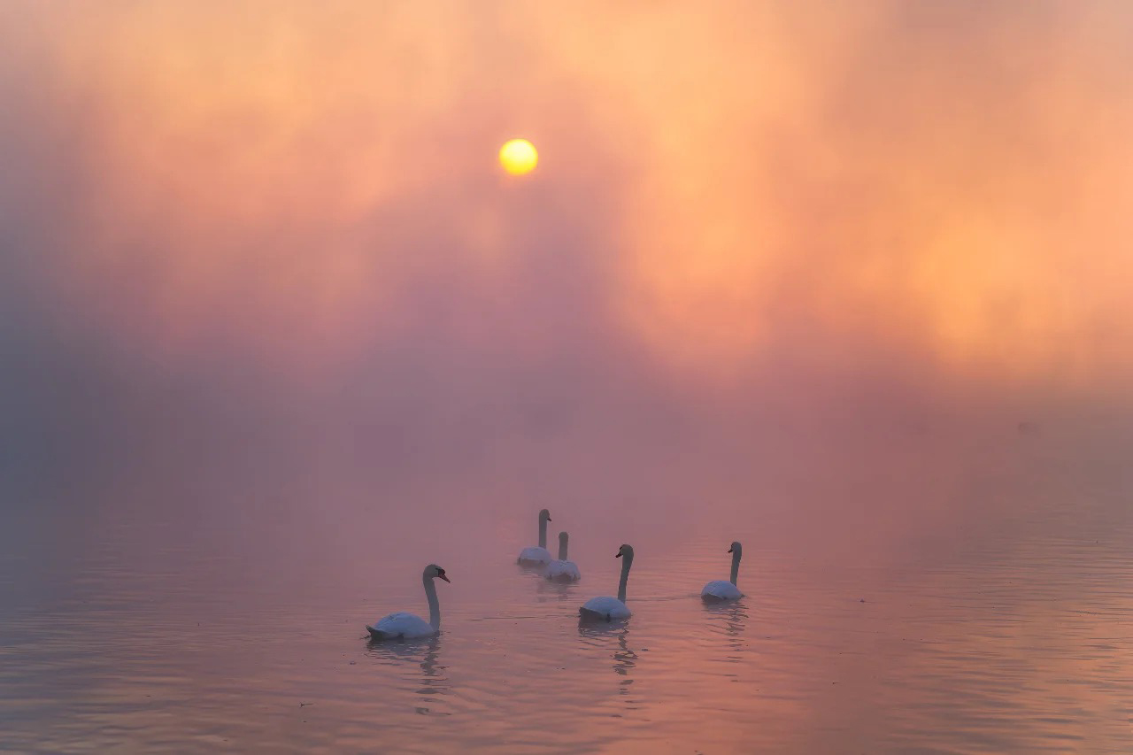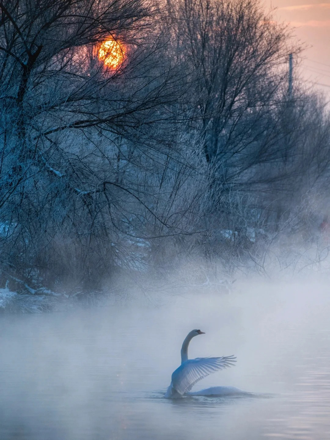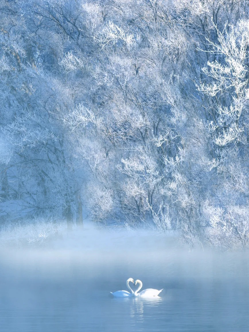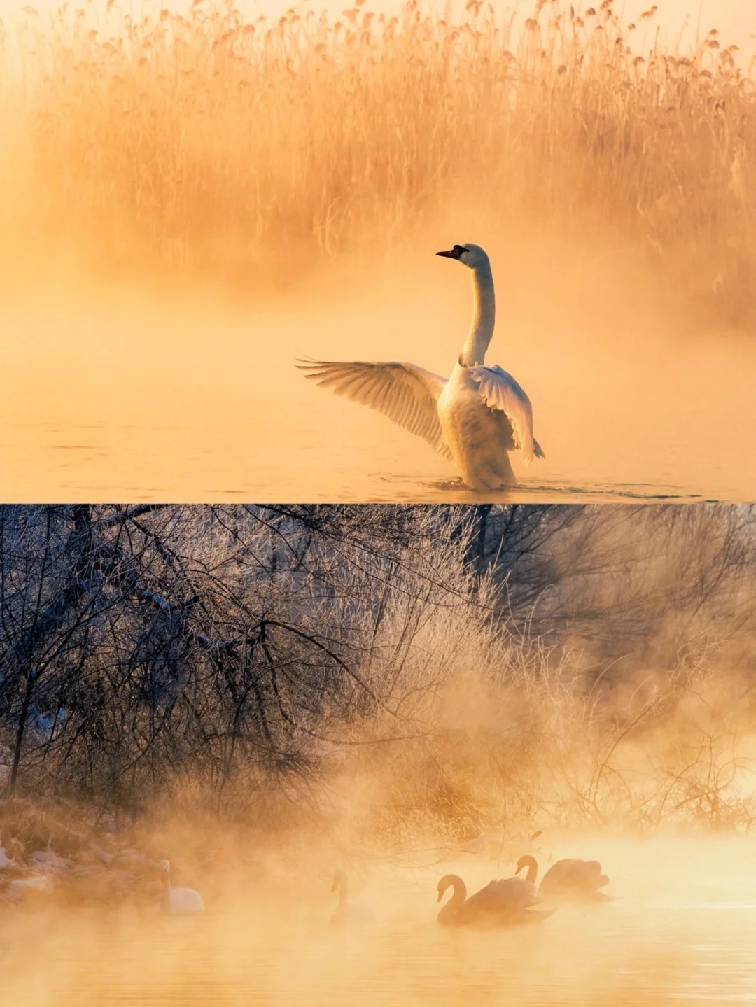 当天鹅的声声啼鸣划破宁静,它们在氤氲的雾气与金色的晨光中悠然游弋、展翅起舞,此情此景,完美复刻了现实版的《天鹅湖》,圣洁而梦幻,令人恍若置身于一个超脱尘世的冰雪童话之中。