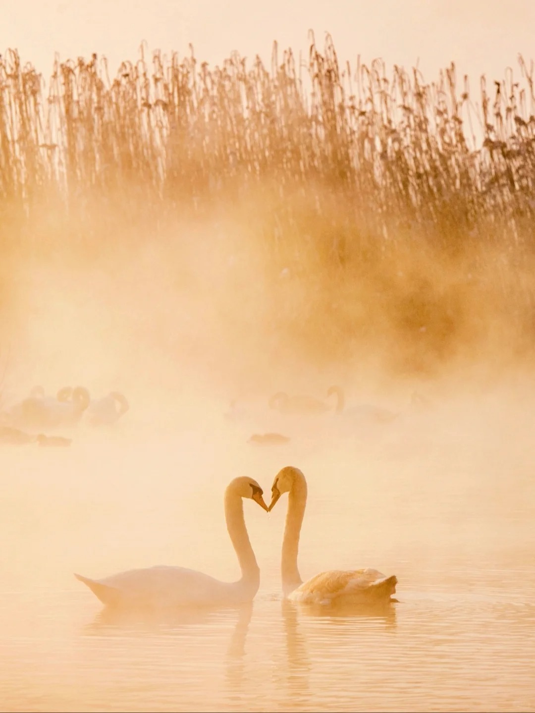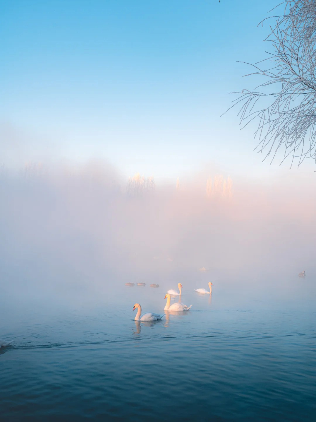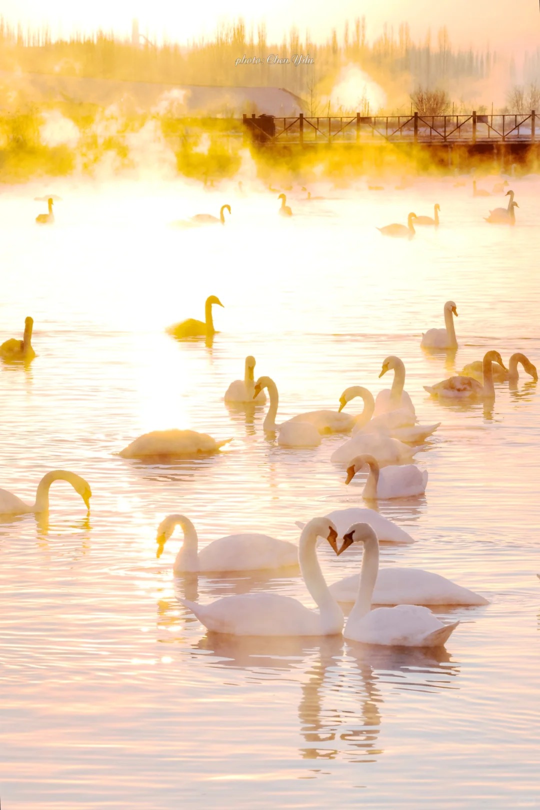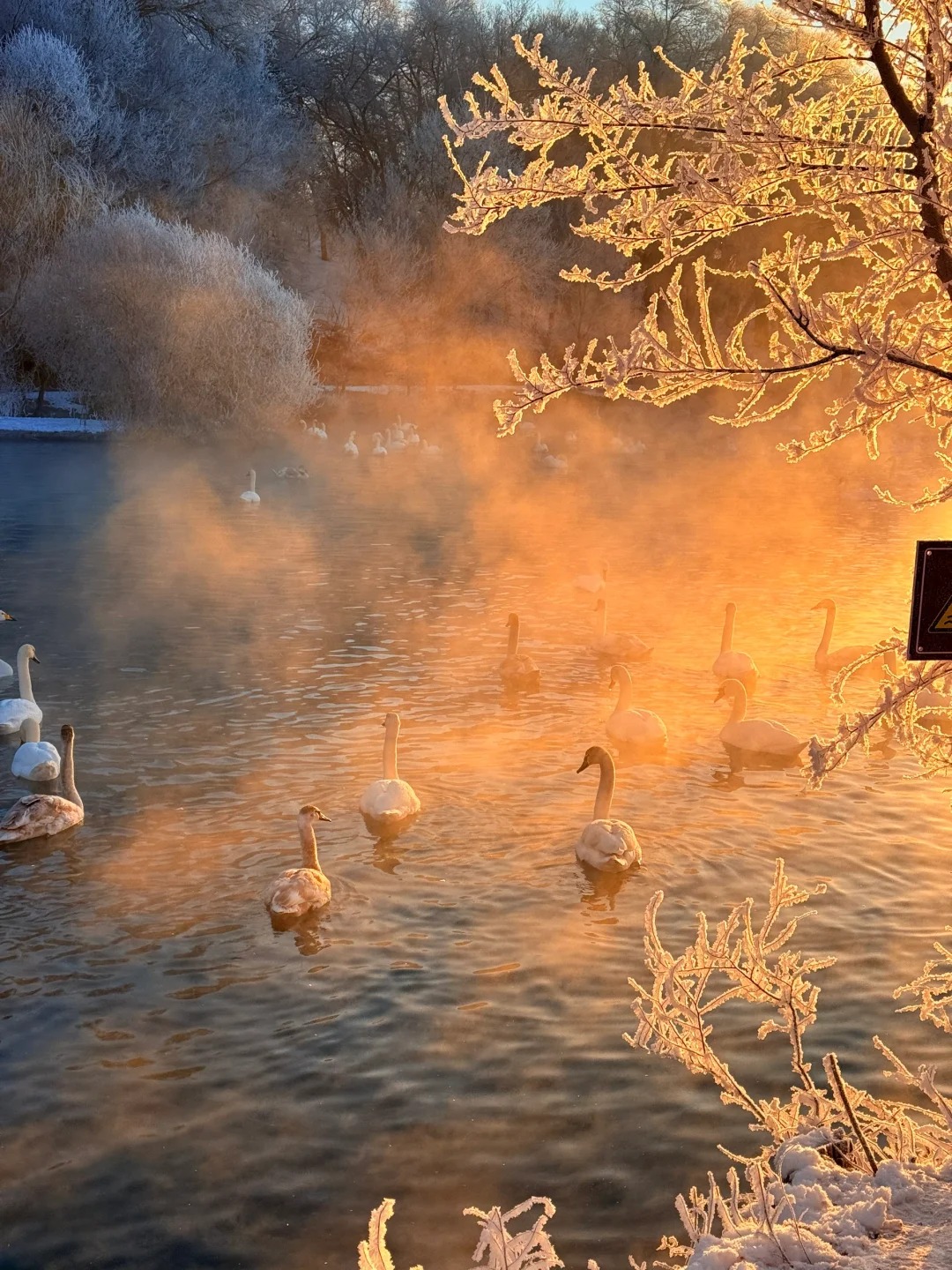 当天鹅的声声啼鸣划破宁静,它们在氤氲的雾气与金色的晨光中悠然游弋、展翅起舞,此情此景,完美复刻了现实版的《天鹅湖》,圣洁而梦幻,令人恍若置身于一个超脱尘世的冰雪童话之中。