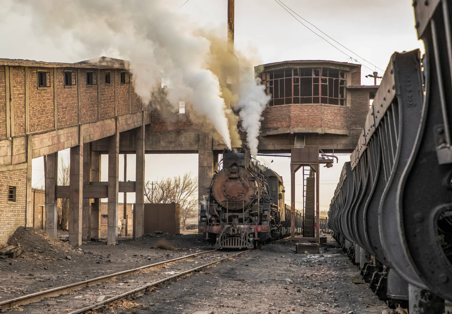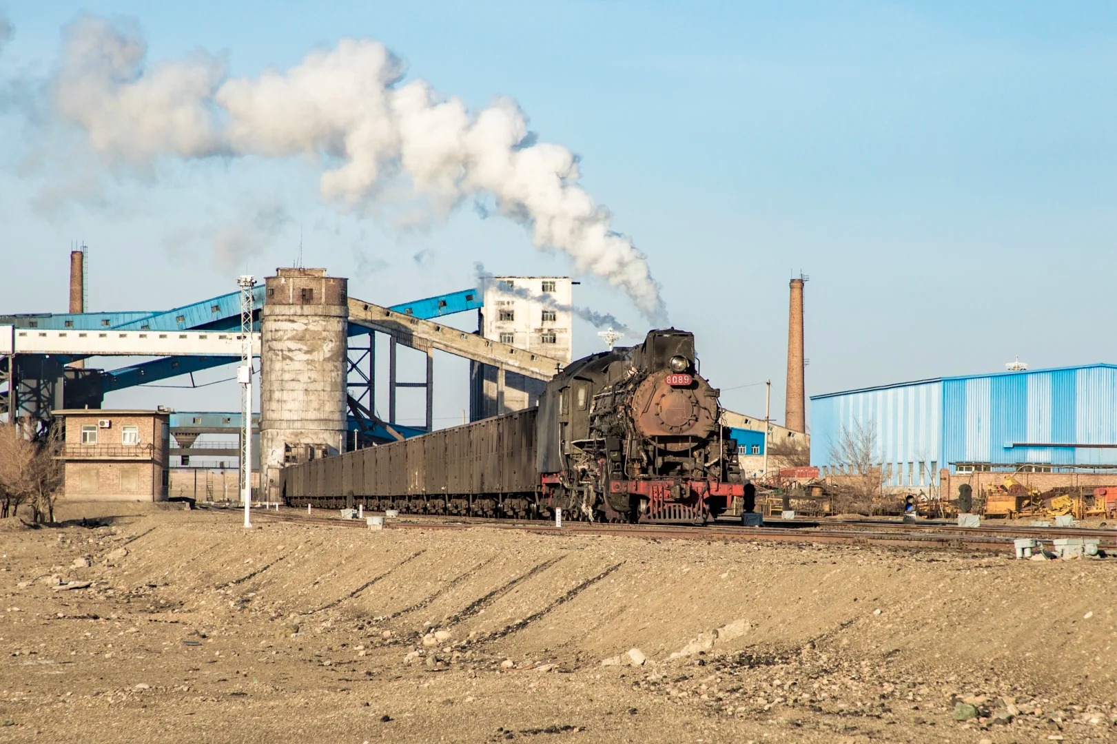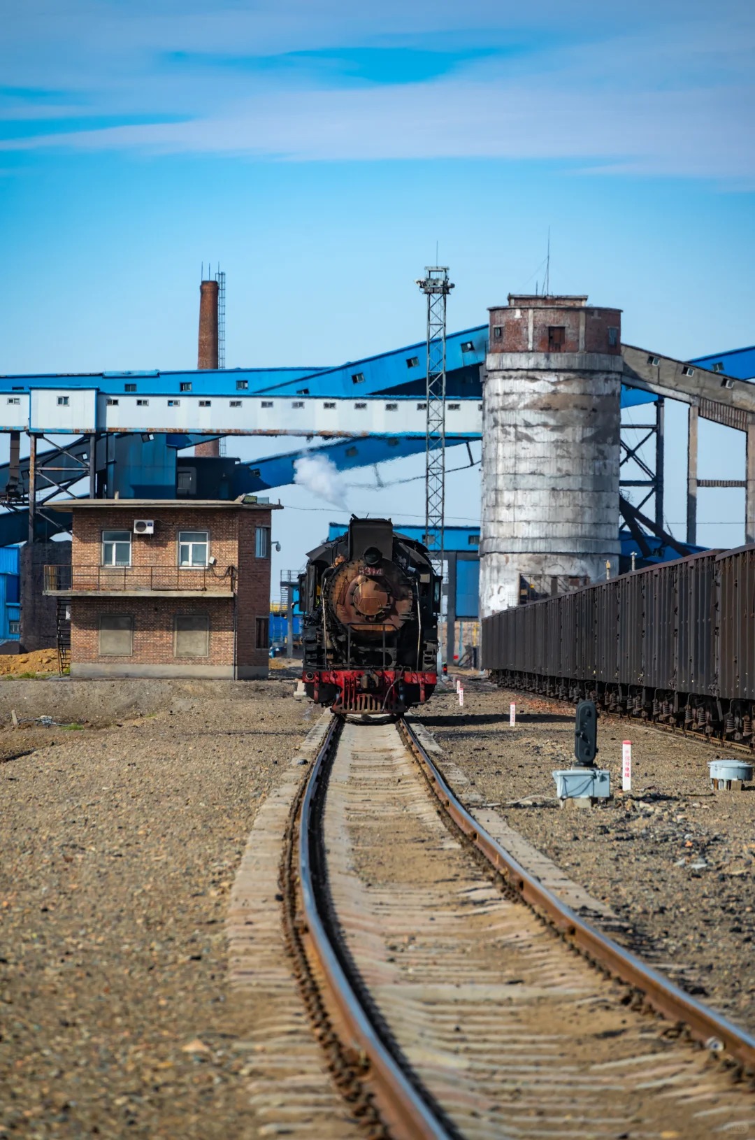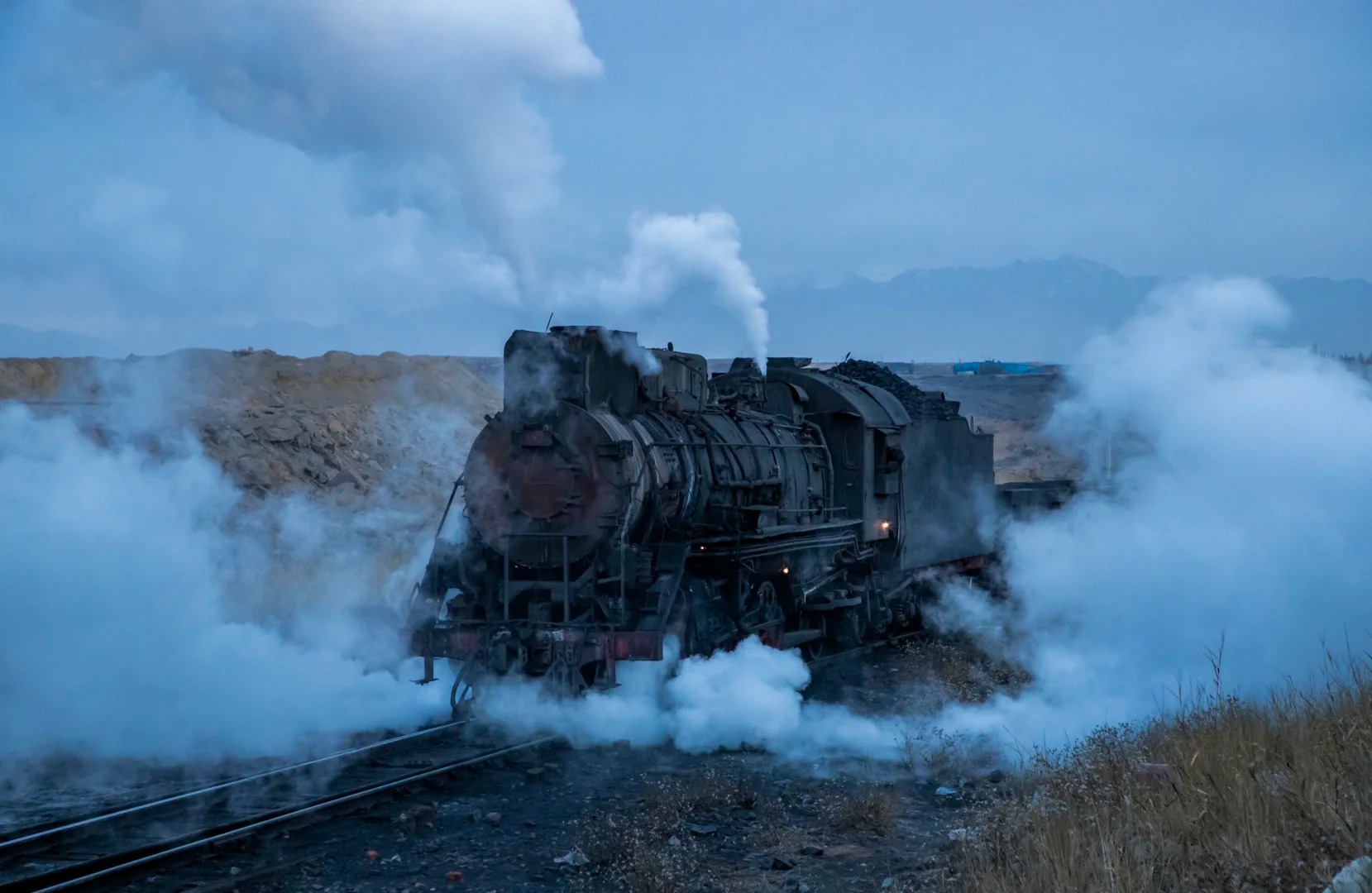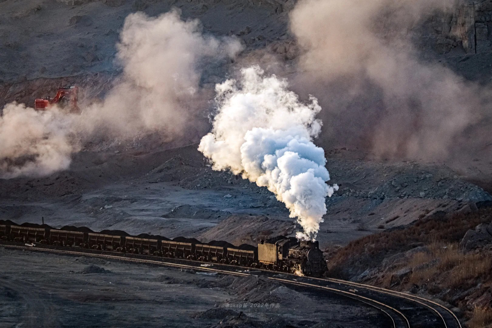 它的核心魅力在于那种跨越时空的工业史诗感。巨大的蒸汽机车(“上游型”蒸汽机车)拖着长长的煤灰,轰鸣着穿梭于茫茫戈壁与庞大的露天矿坑之间,喷涌出的白色汽柱在荒凉的地平线上格外醒目。这种粗犷、力量与浪漫交织的景象,是工业时代最后的余晖,也是摄影镜头下极具冲击力的画面。