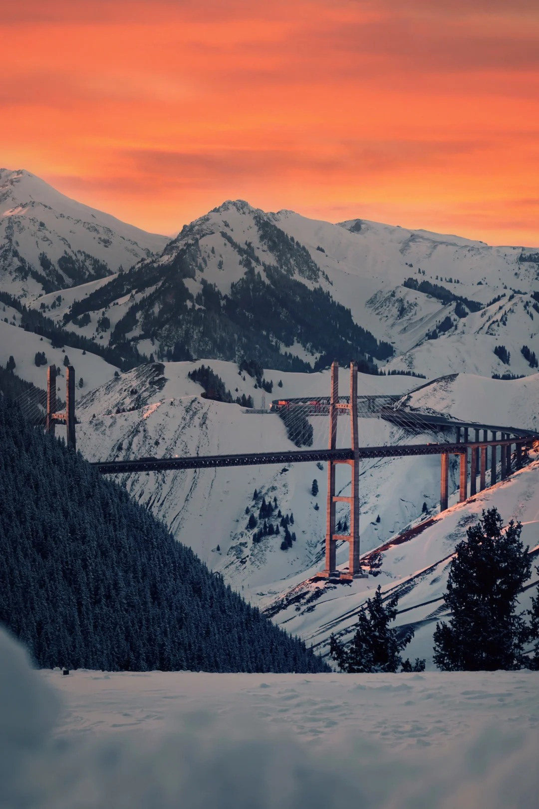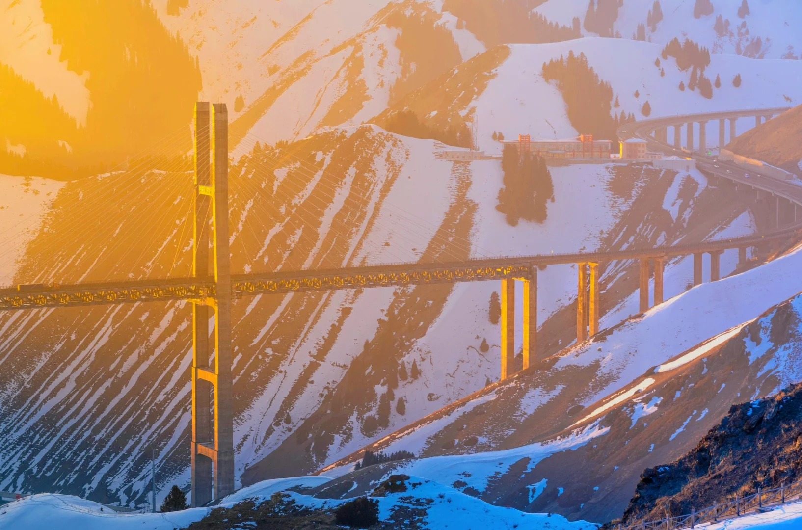 它的核心魅力在于那种人工奇迹与自然奇观的强烈碰撞与和谐统一。大桥的桥面距谷底高达约200米,巍峨的桥塔穿出云杉林,巨大的钢索如琴弦般拉起笔直的桥面,横跨在郁郁葱葱的果子沟上空。当您驾车行驶其上,仿佛凌空飞渡,两侧是连绵的雪山、茂密的森林和深邃的峡谷,360°的无敌景观令人心潮澎湃,被誉为“中国最美公路桥梁”之一。