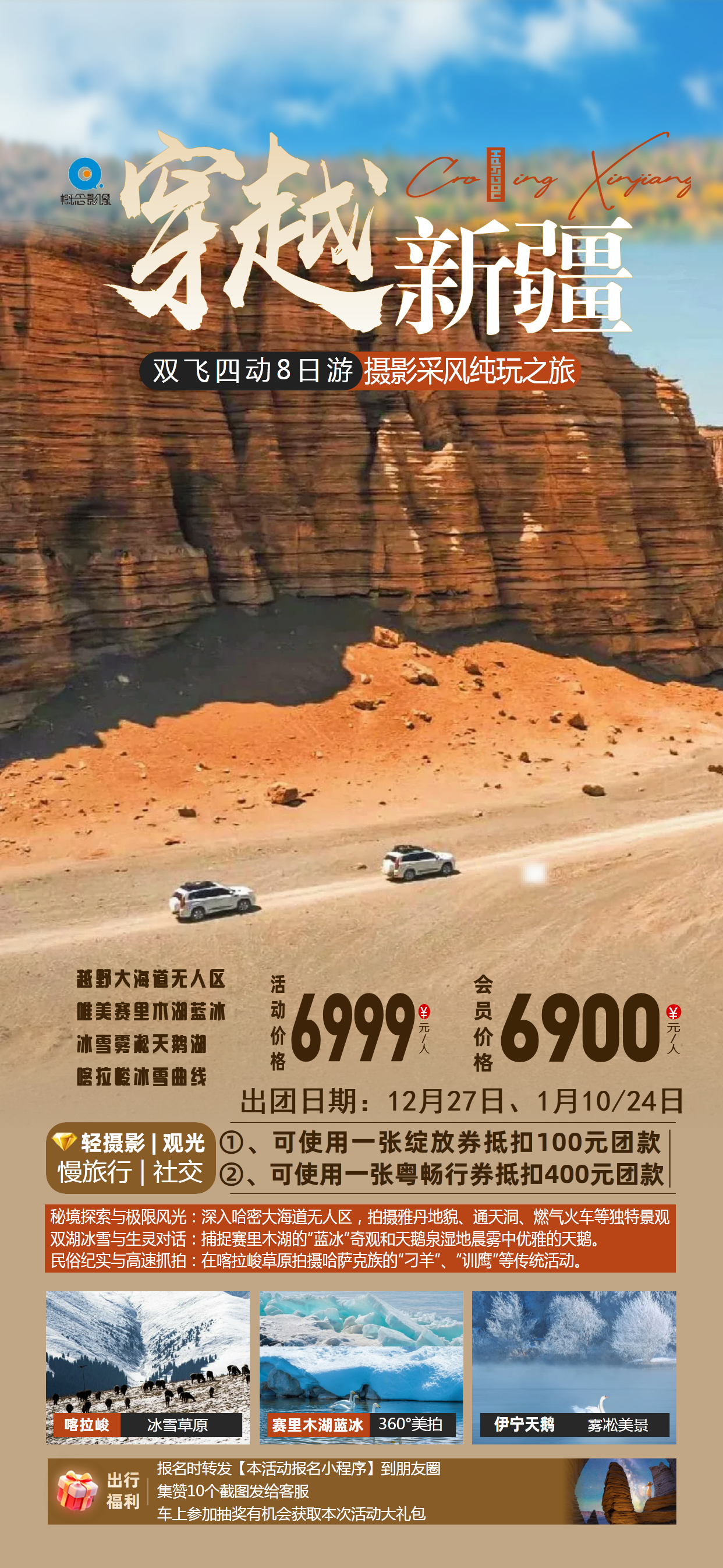 费用包含:广州-乌鲁木齐往返机票+机场税及燃油附加费;3晚携程四钻+1晚大海道民宿酒店+1晚天鹅泉民宿+2晚携程五钻住宿;当地旅游用车+2天越野车(3人/车);疆内四段动车接驳;5个特色午餐;摄影指导老师+导游服务+50万国内旅游意外险。