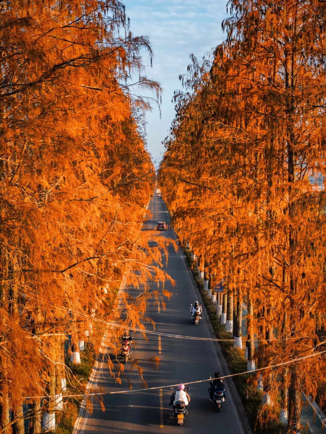 在广东的北端,藏着一条秋冬季惊艳时光的秘密通道——始兴县道344线。这里不仅是大自然精心绘制的一幅油画,更是摄影爱好者和旅行者心中的向往之地,被热情地称为“最美乡村公路”。 每到秋冬交替之际,道路两旁高耸的落羽杉仿佛开启了季节的魔法箱。原本绿意盎然的叶子开始上演一场华美的变装秀,从黄绿相间渐次过渡至如火般的橙红,如同燃烧的晚霞落于大地,美得摄人心魄。
