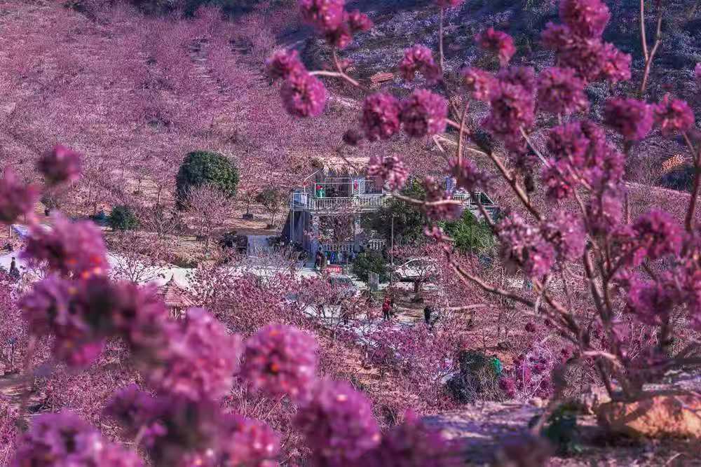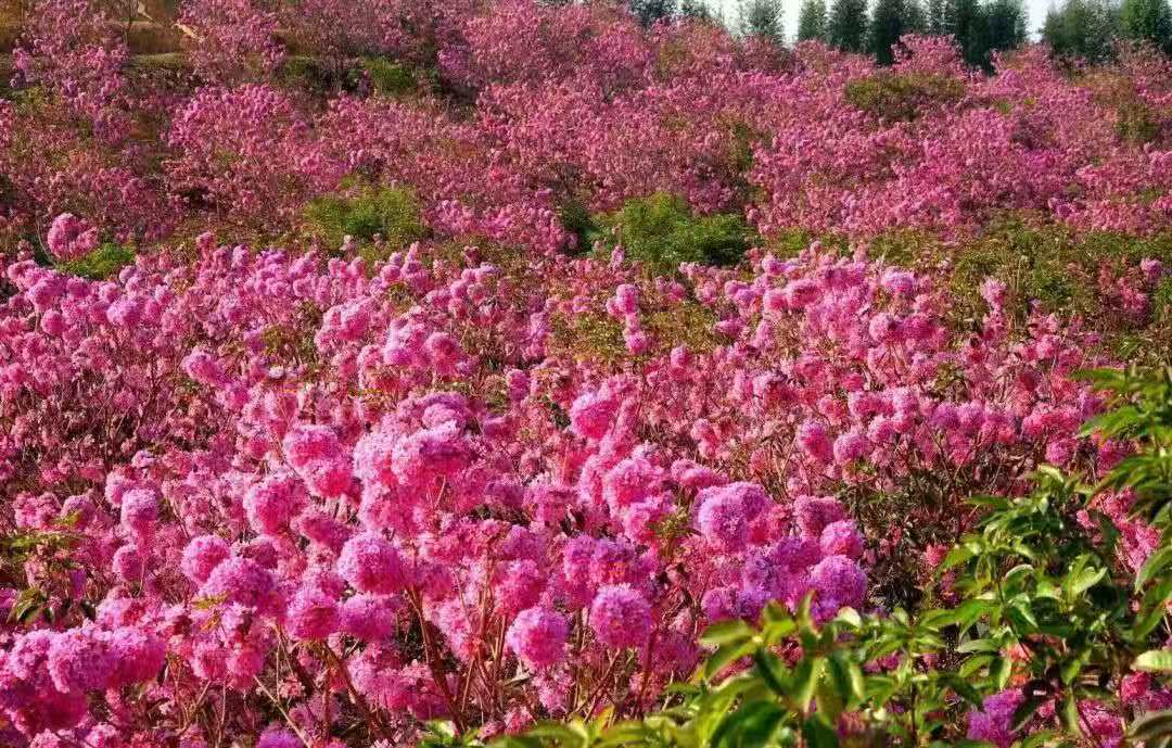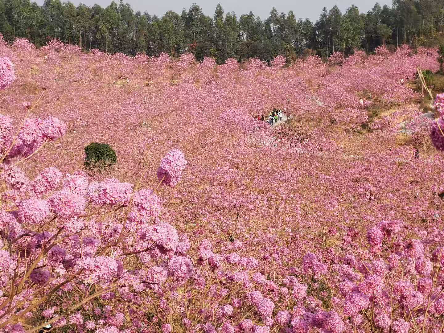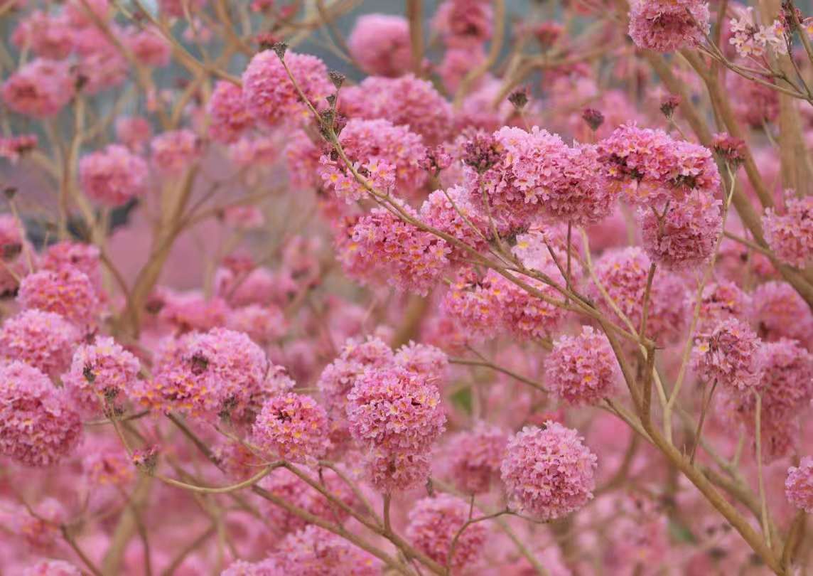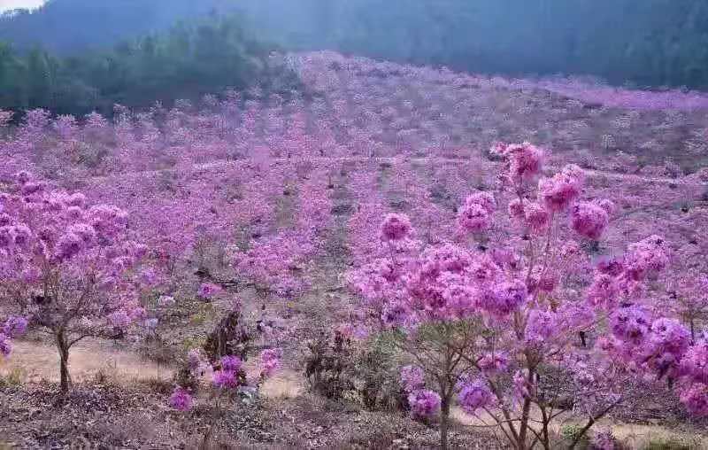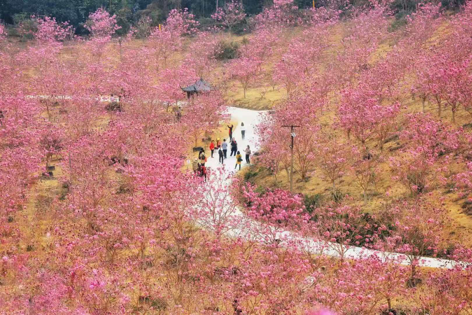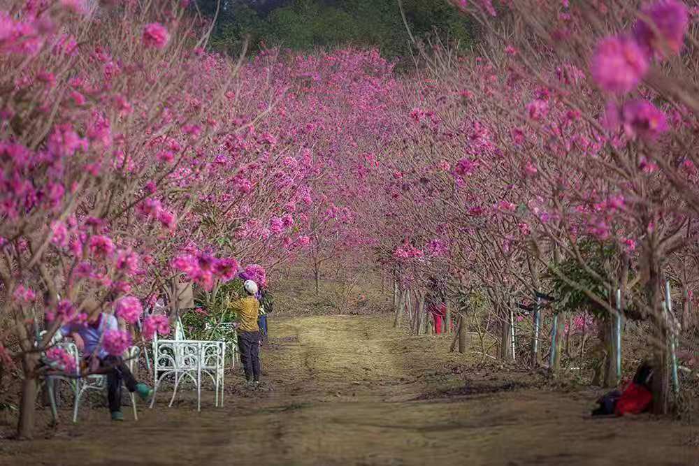 绿美生态园种植了超过6000棵自南美洲引入的紫花风铃木。每年冬季至初春(12月至次年3月,盛花期通常在1-2月),粉色与紫色交织的花球簇拥枝头,远观如云霞,近看如童话世界,是拍摄浪漫大片的绝佳外景地。