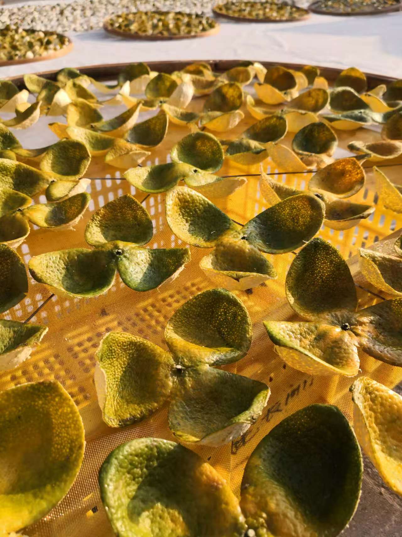 成千上万的柑皮在大型晒场或村落房前屋后铺开,形成一片片金色的海洋,场景非常壮观。传统的“麻袋串灶尾熏,麻袋装阁楼放”的储存方式也极具画面感。