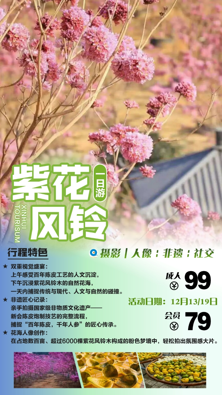 双重视觉盛宴:上午感受百年陈皮工艺的人文沉淀,下午沉浸紫花风铃木的自然花海,一天内捕捉传统与现代、人文与自然的碰撞。