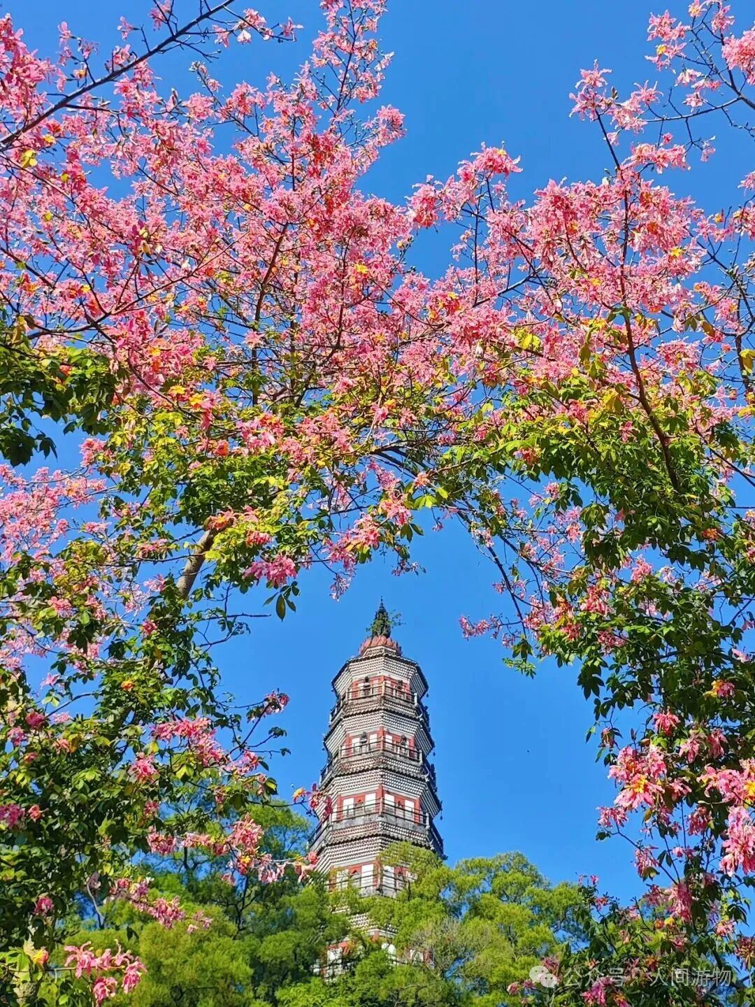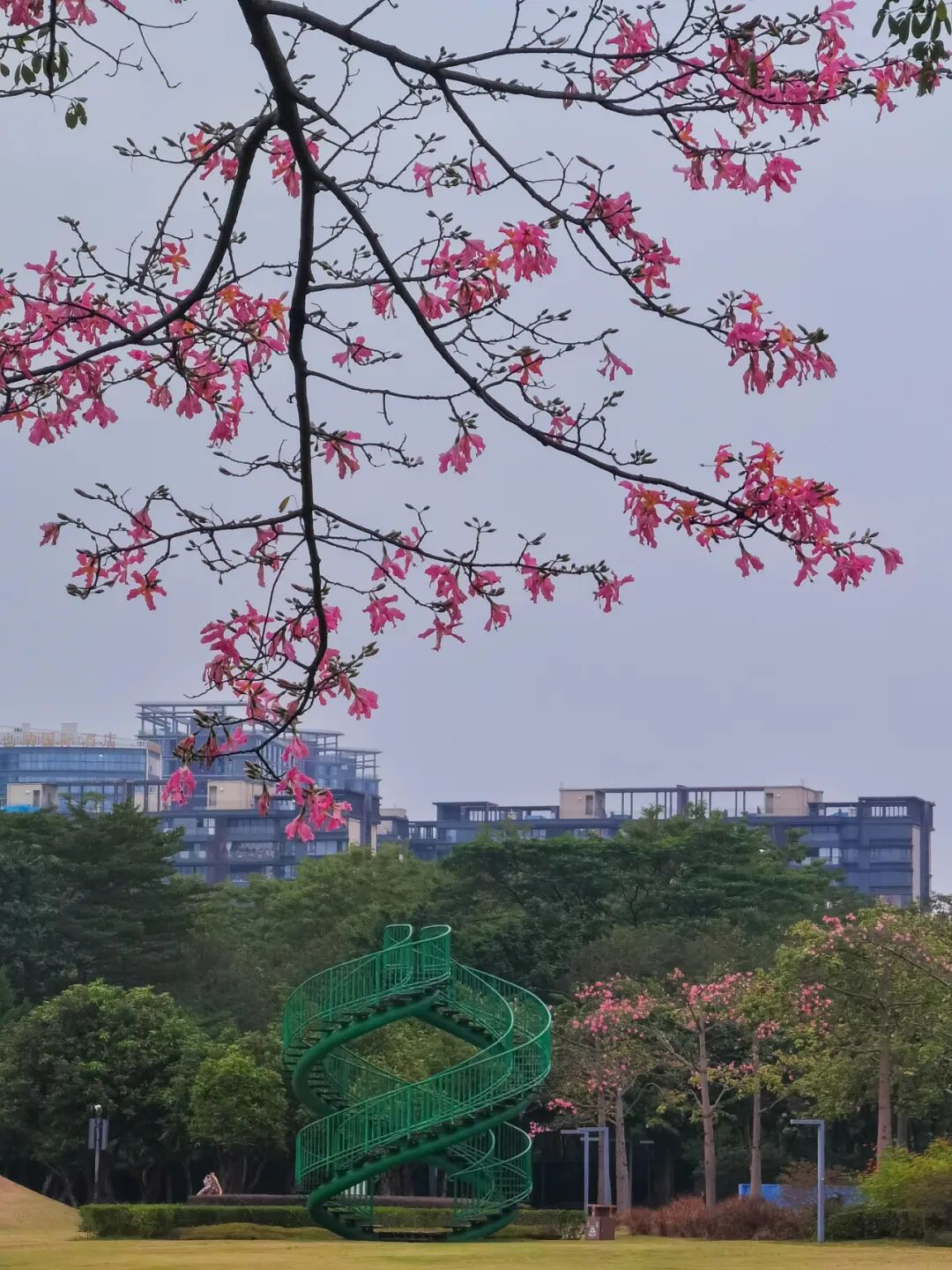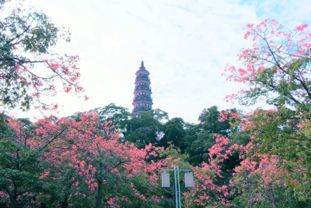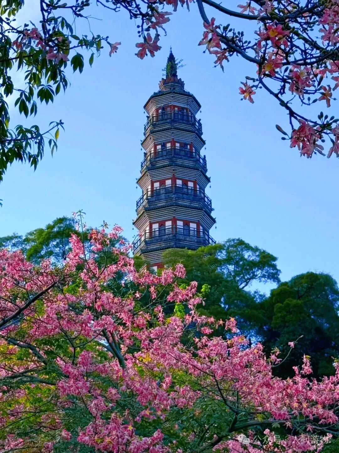 2、乘车前往顺德顺峰山公园,拍摄异木棉,青云塔下异木棉与明代古塔同框,粉色花海衬托古塔的挺拔,构图兼具自然与人文底蕴;湖心岛与玉带桥:环湖花树倒映水中,可拍摄花瓣飘落湖面的动态场景,低机位仰拍可捕捉"花瀑"效果。