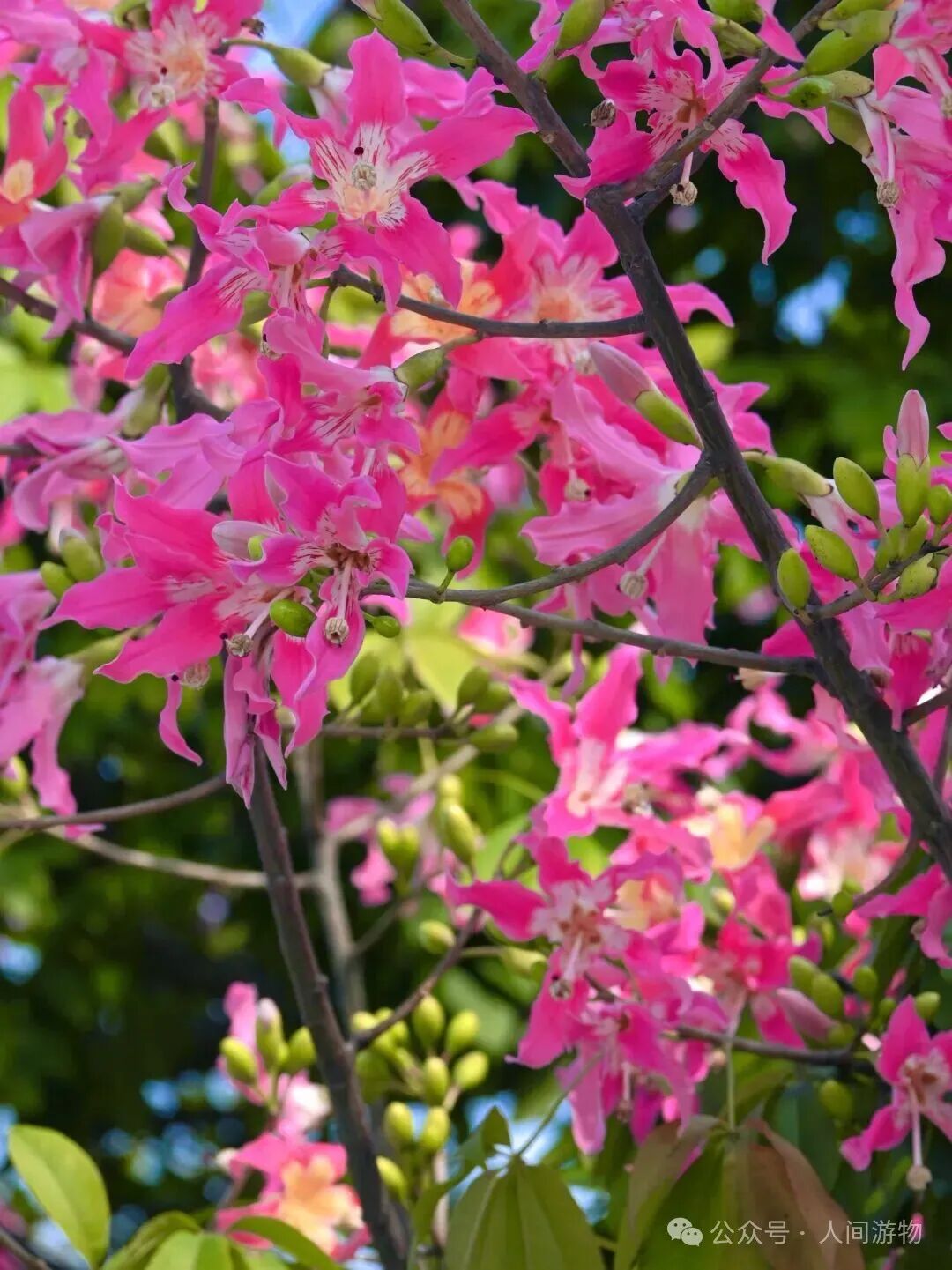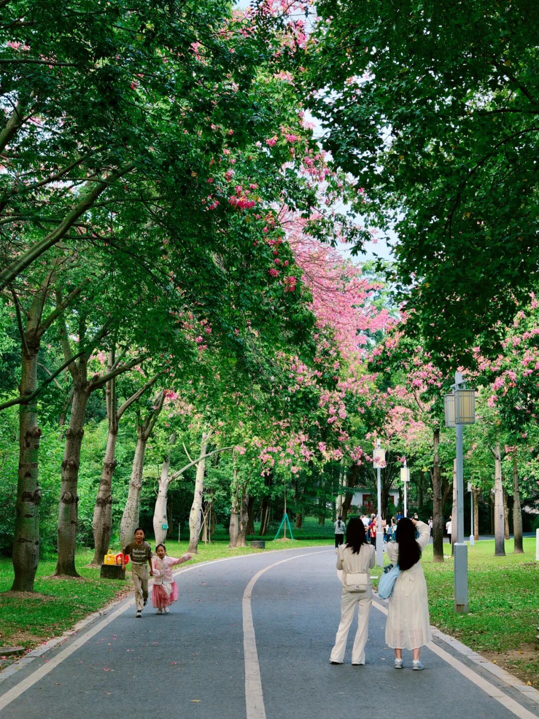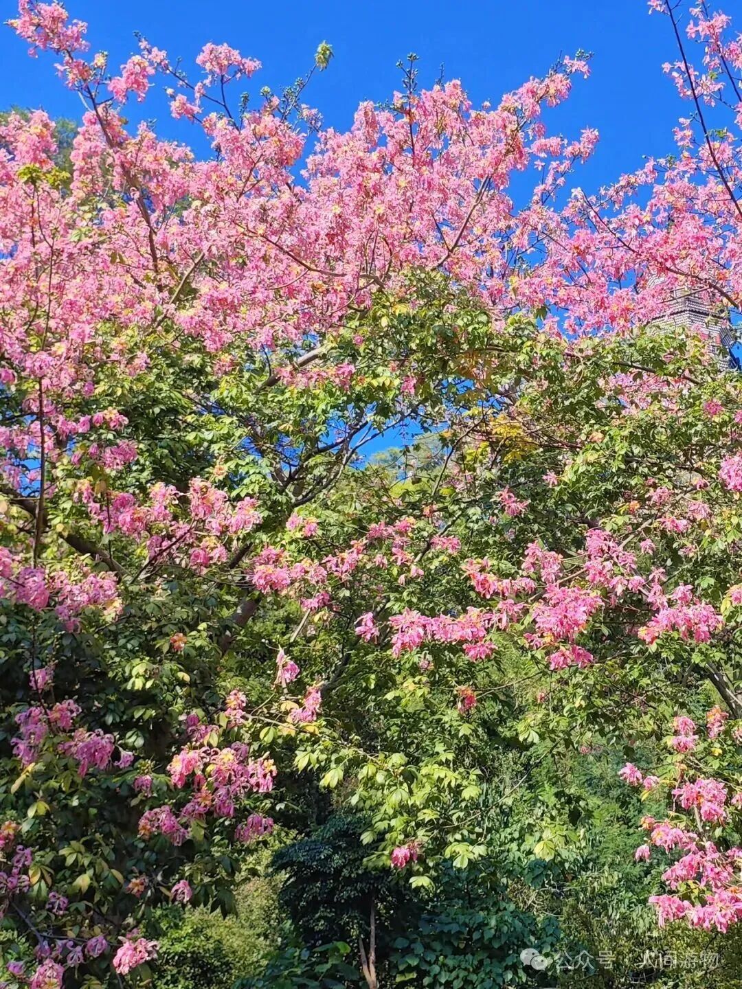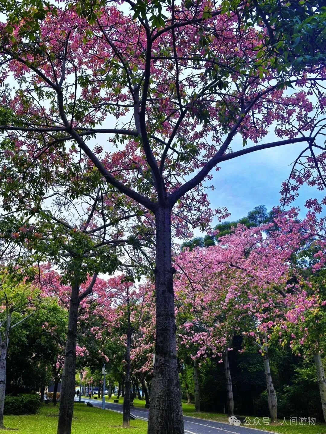 2、乘车前往顺德顺峰山公园,拍摄异木棉,青云塔下异木棉与明代古塔同框,粉色花海衬托古塔的挺拔,构图兼具自然与人文底蕴;湖心岛与玉带桥:环湖花树倒映水中,可拍摄花瓣飘落湖面的动态场景,低机位仰拍可捕捉"花瀑"效果。