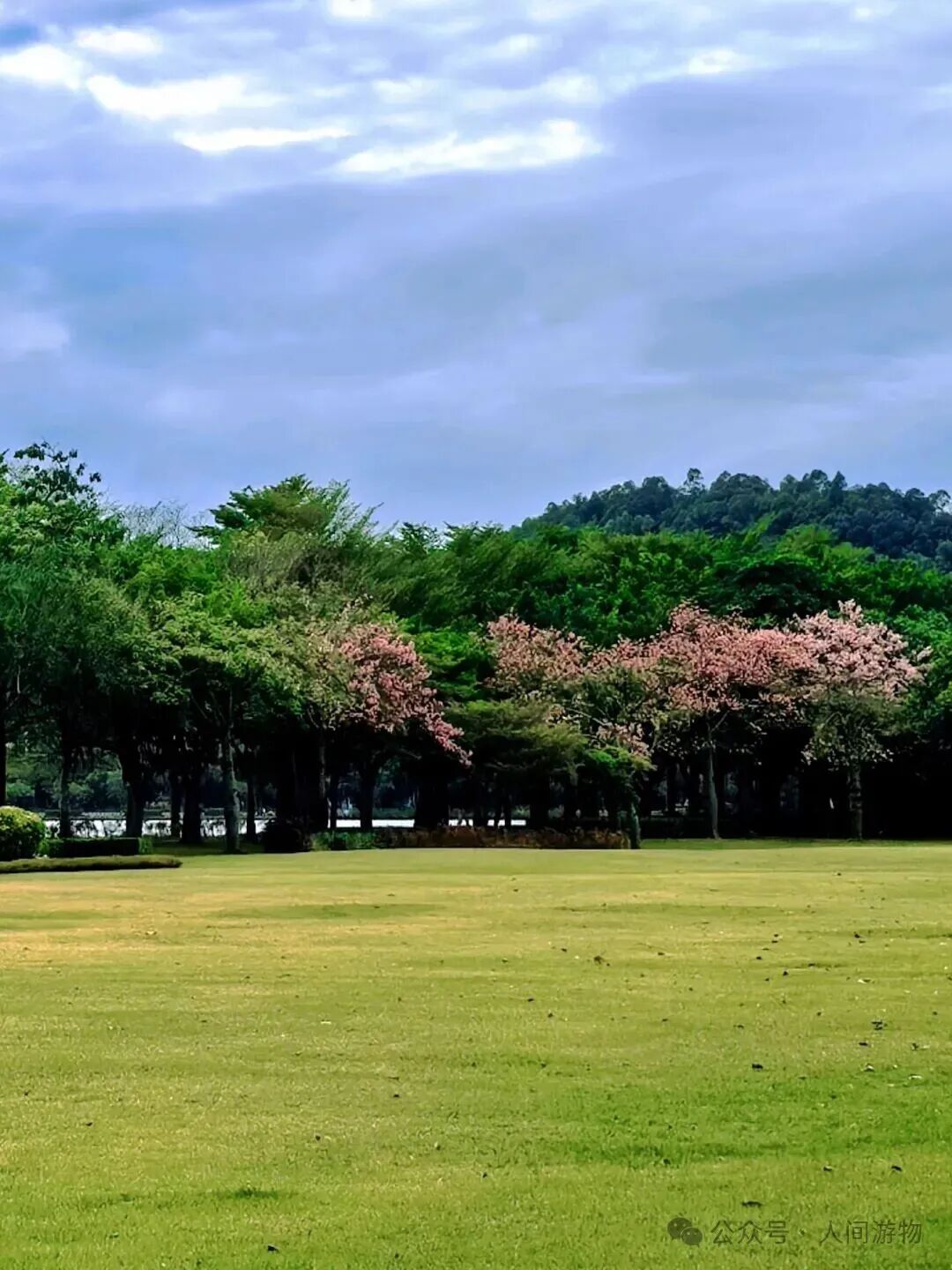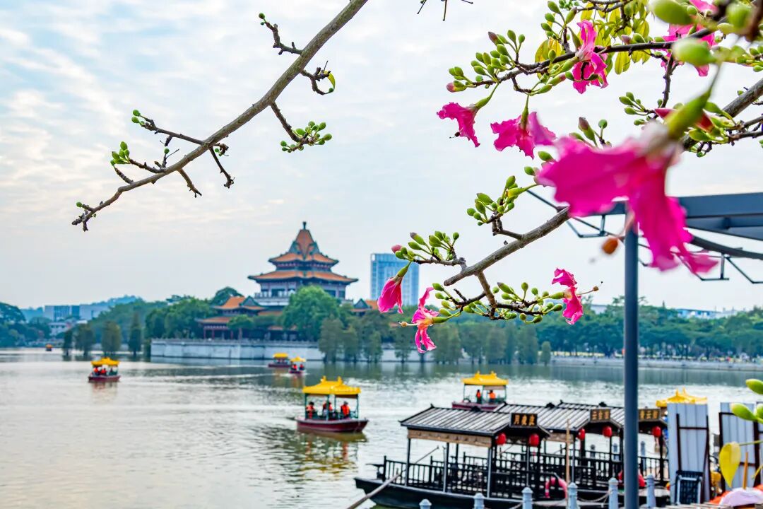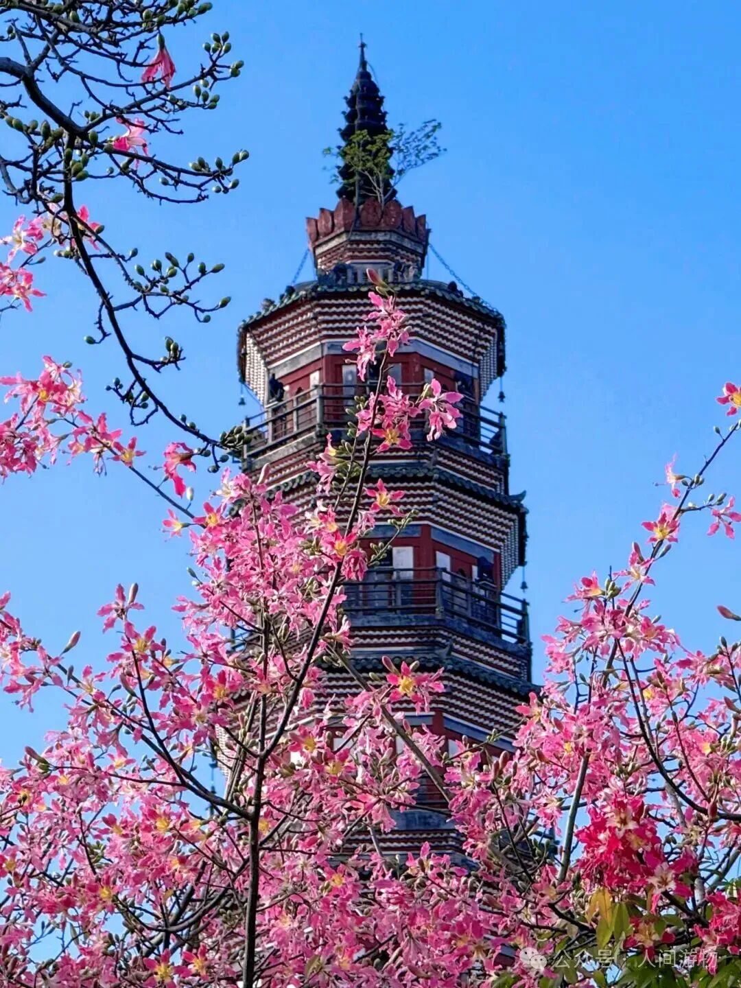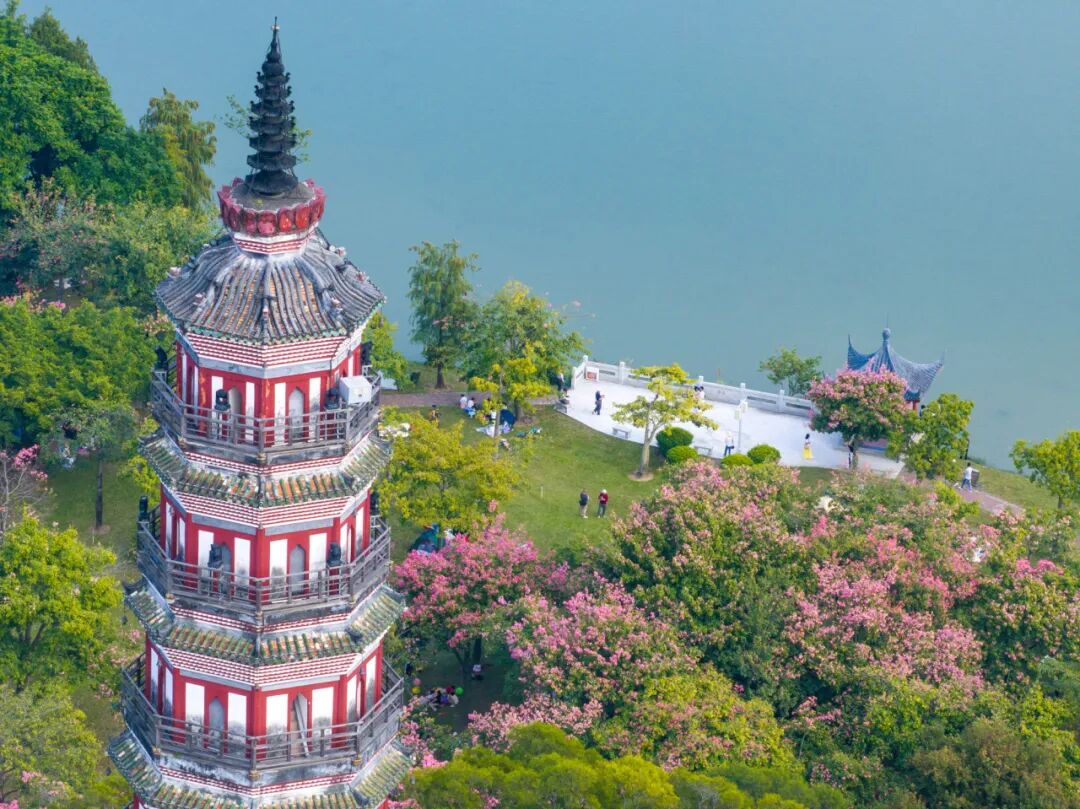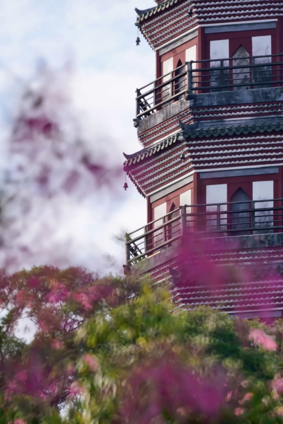 异木棉(美人树)盛花期(11月)形成大片粉紫色花云,与明代青云塔构成“古塔映花”的独特画面,兼具自然浪漫与人文底蕴;湖心岛倒影、湿地花海全景、玉带桥“花瓣雨”(低机位仰拍花瀑)、环湖绿道纵深构图。