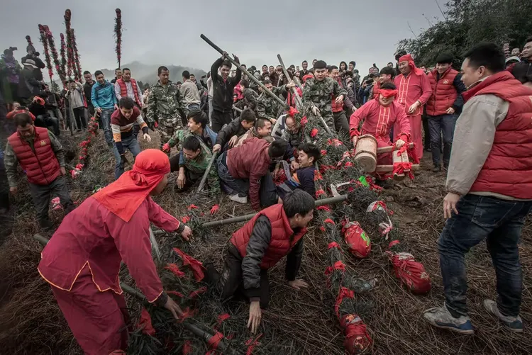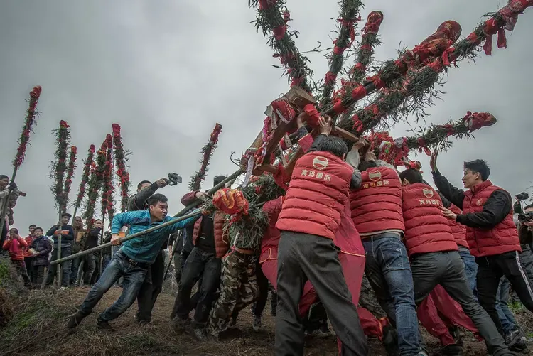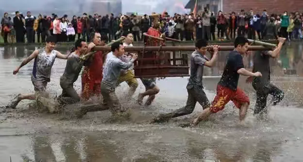 走古事:每年的正月十五,福建龙岩连城县罗坊镇在数以万计的乡民和游客簇拥下,客家民俗“走古事”开始。7棚“古事”一齐向前奔走,先在旱地里奔,随后向村头河里奔。谁先到达终点谁就赢,来年就会福气连连。