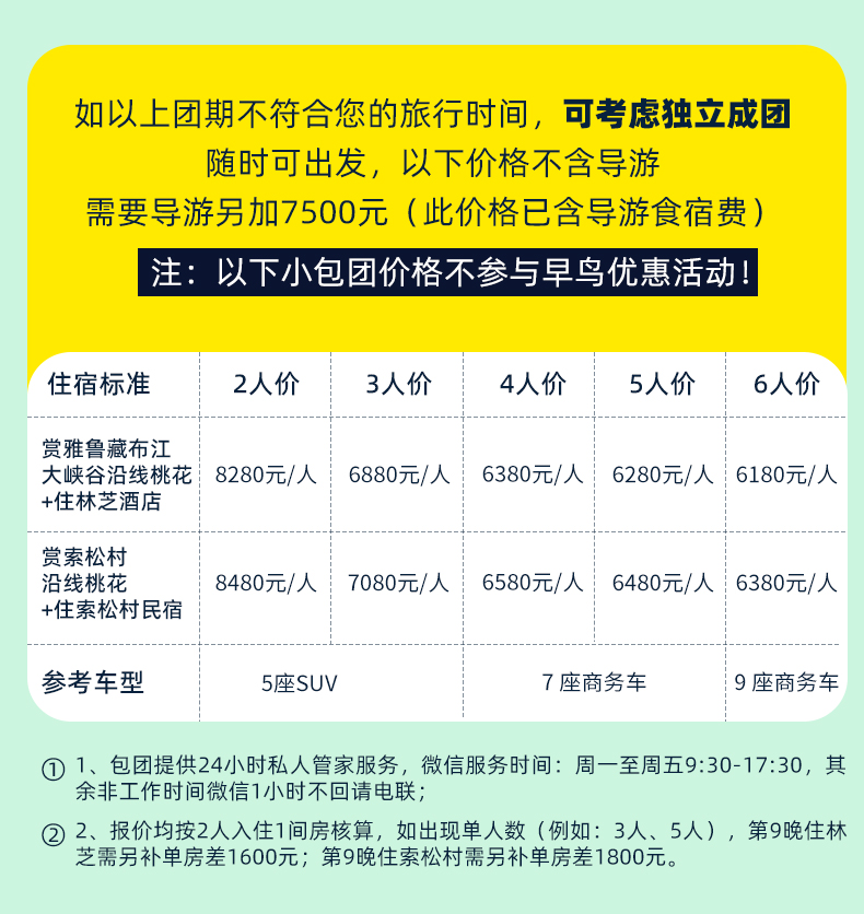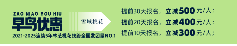 为保障最佳观赏体验,在行程第9天我们根据桃花花期的差异设计了2种方案,第01-04期雅鲁藏布江大峡谷沿线桃花更盛,第05-08期索松村沿线桃花更盛,您可根据偏好选择心仪的团期出发。