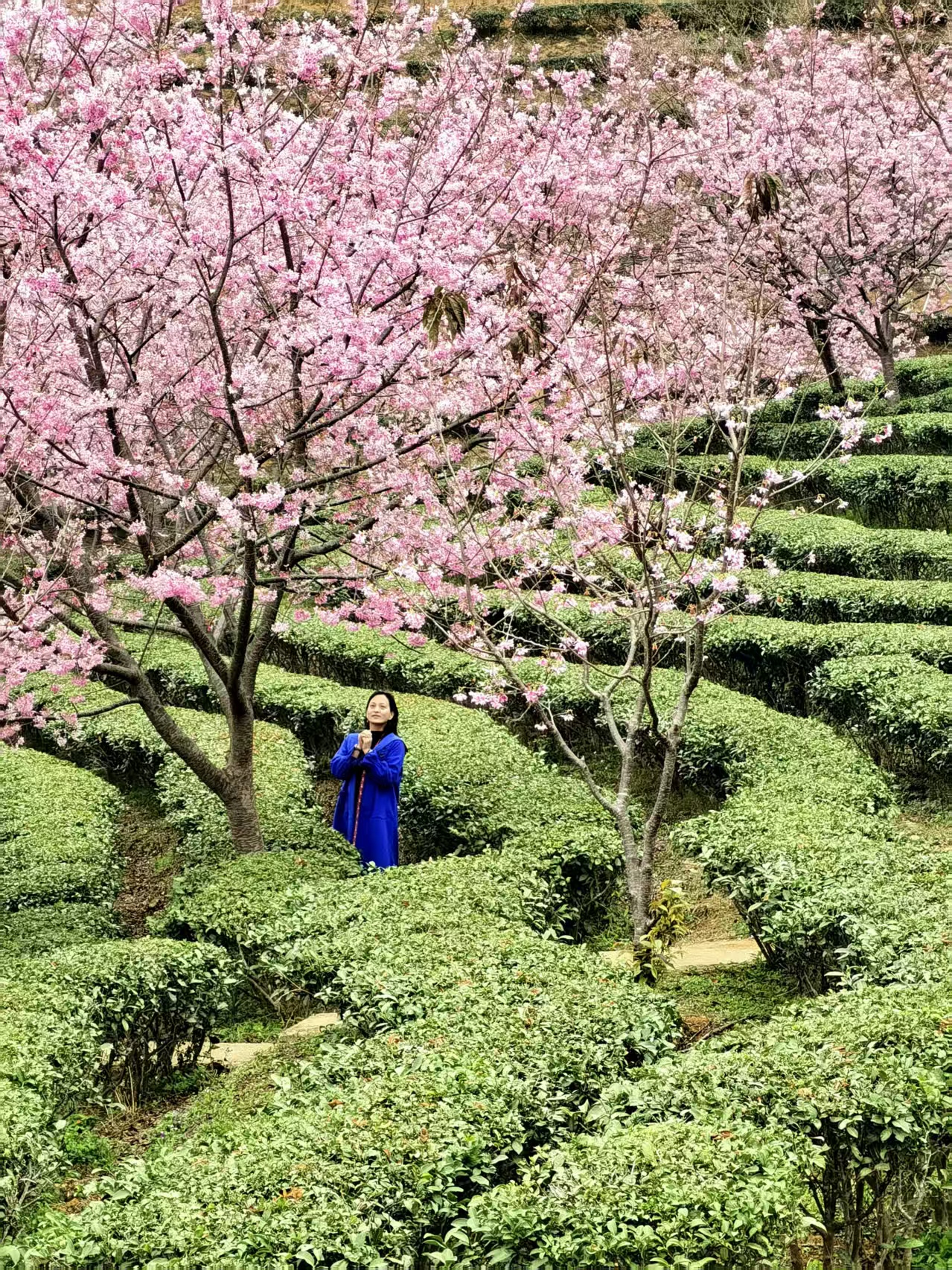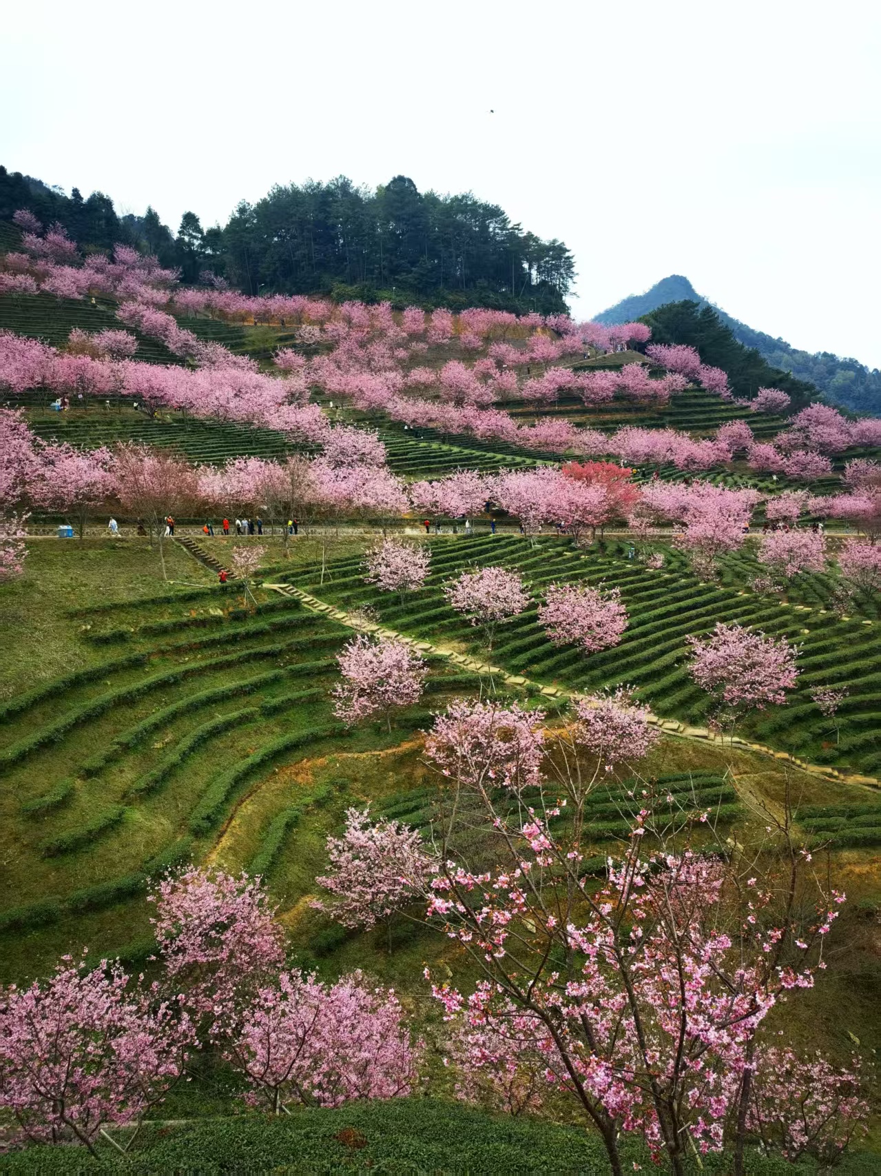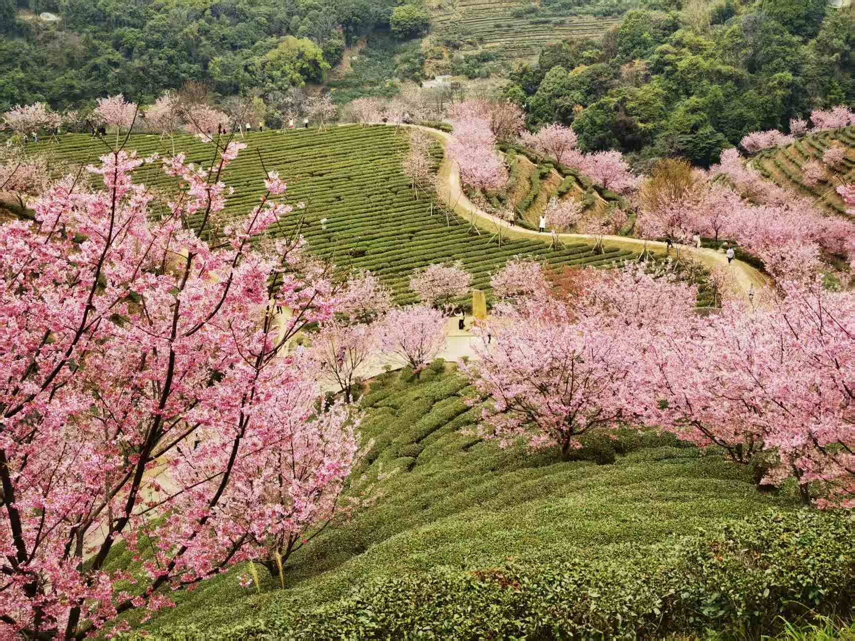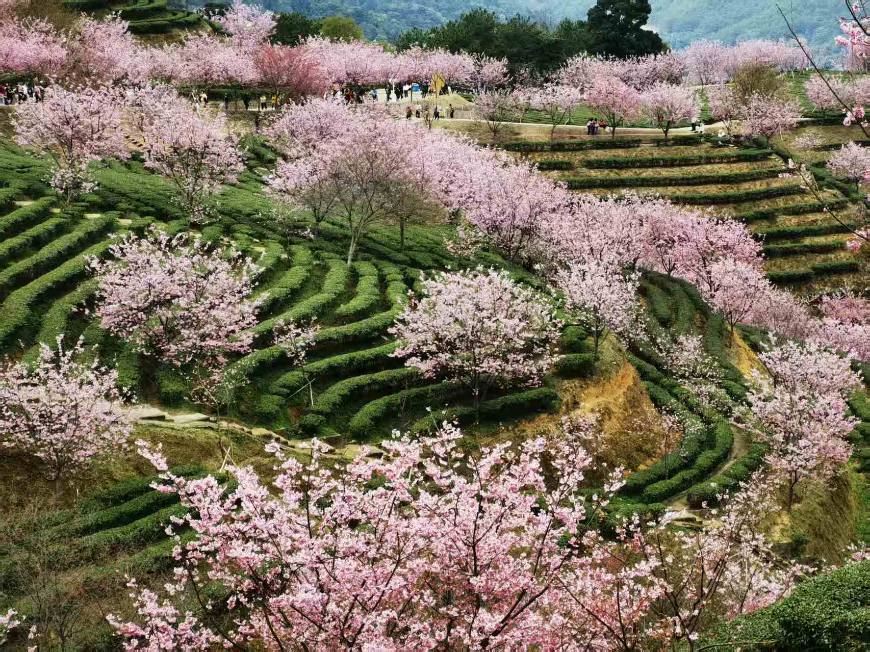 网红打卡点推荐:樱花观景台(俯瞰茶田樱花全景)、樱花小径(花瓣铺路,适合人像拍摄)。建议穿着白色、淡粉、浅绿或汉服等浅色系服装,与粉色花海形成温柔对比。