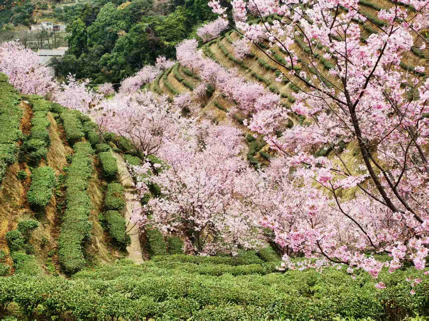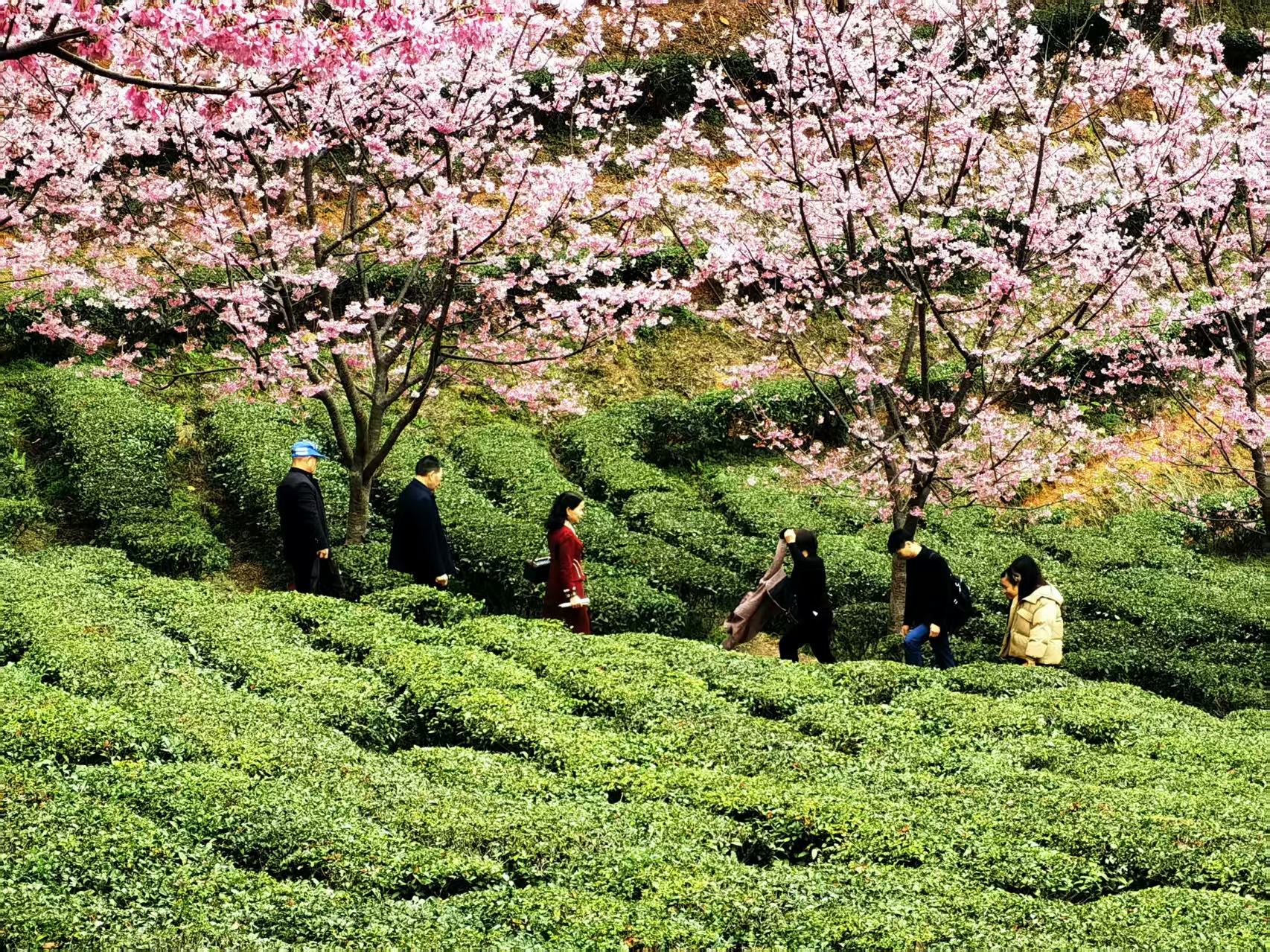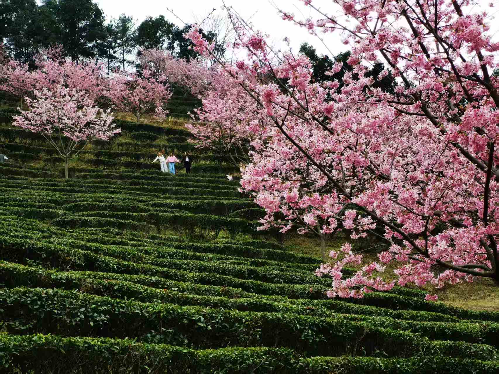 网红打卡点推荐:樱花观景台(俯瞰茶田樱花全景)、樱花小径(花瓣铺路,适合人像拍摄)。建议穿着白色、淡粉、浅绿或汉服等浅色系服装,与粉色花海形成温柔对比。