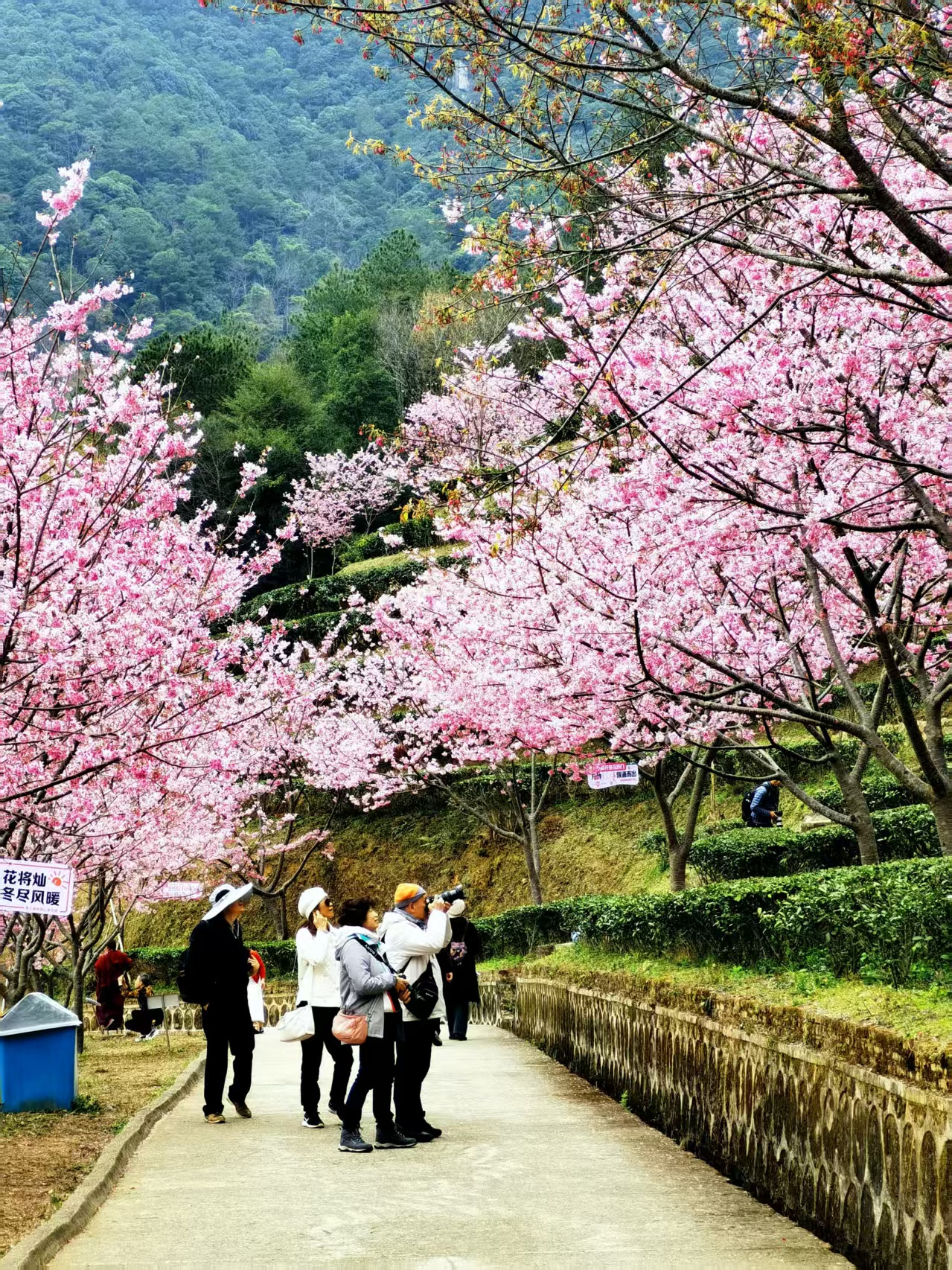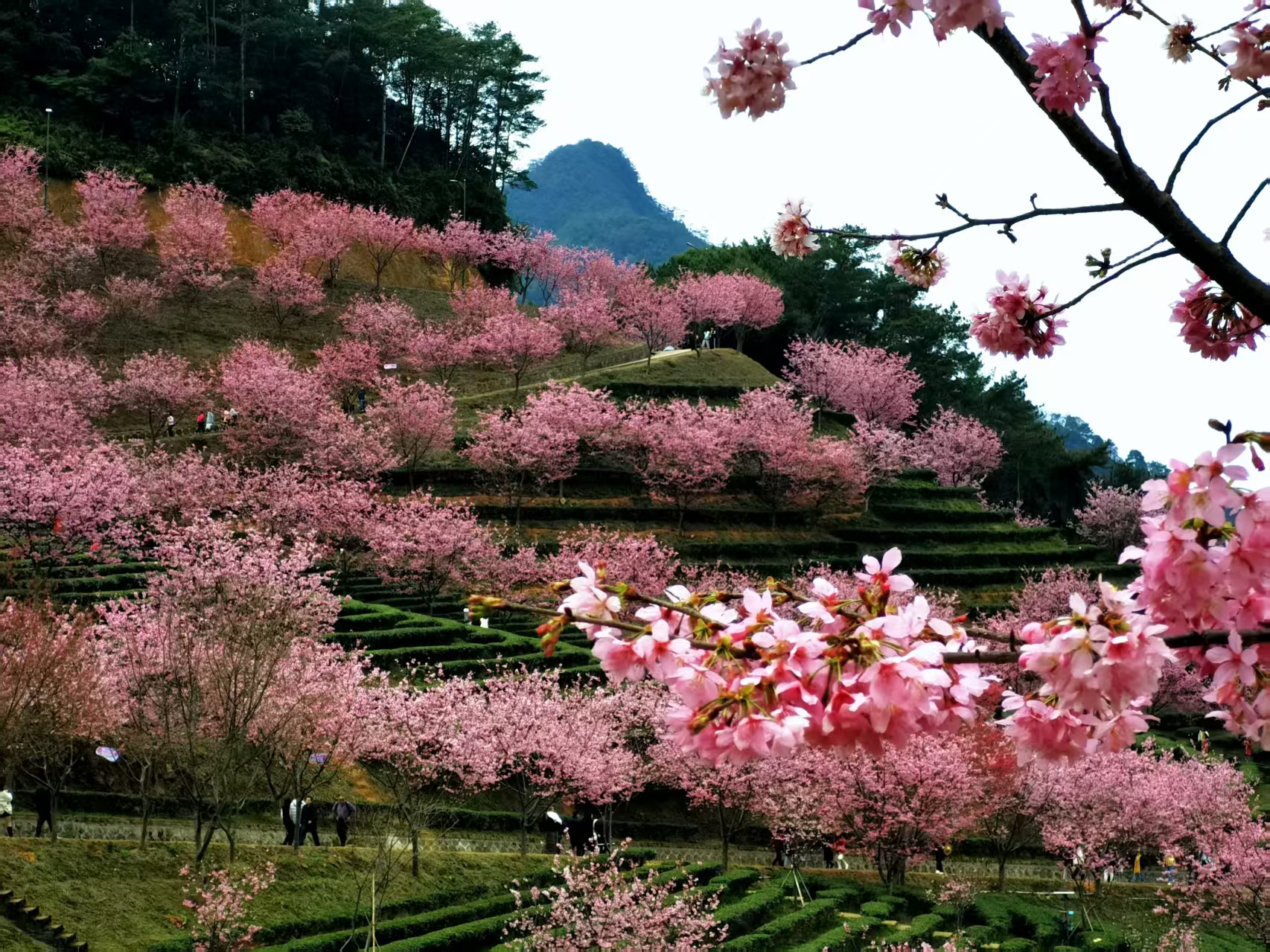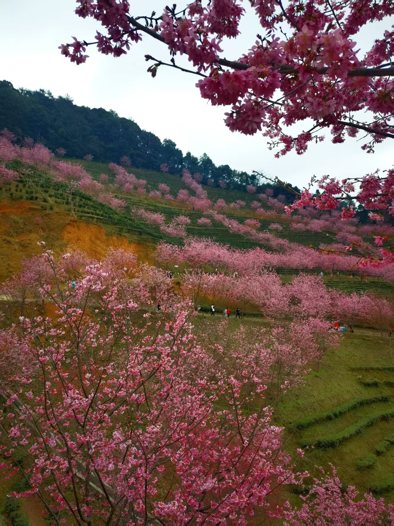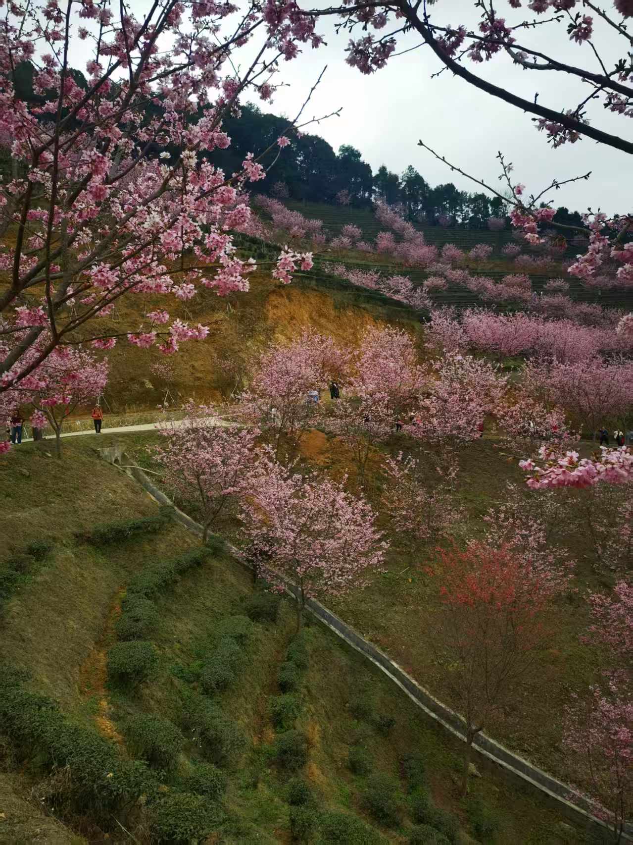 网红打卡点推荐:樱花观景台(俯瞰茶田樱花全景)、樱花小径(花瓣铺路,适合人像拍摄)。建议穿着白色、淡粉、浅绿或汉服等浅色系服装,与粉色花海形成温柔对比。