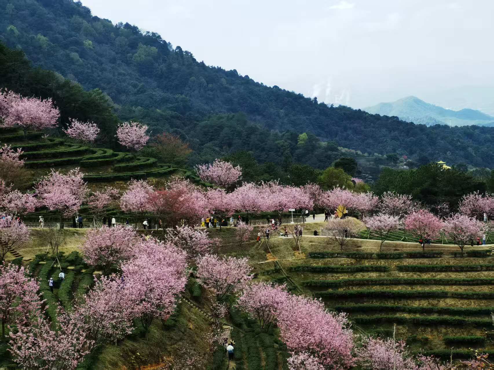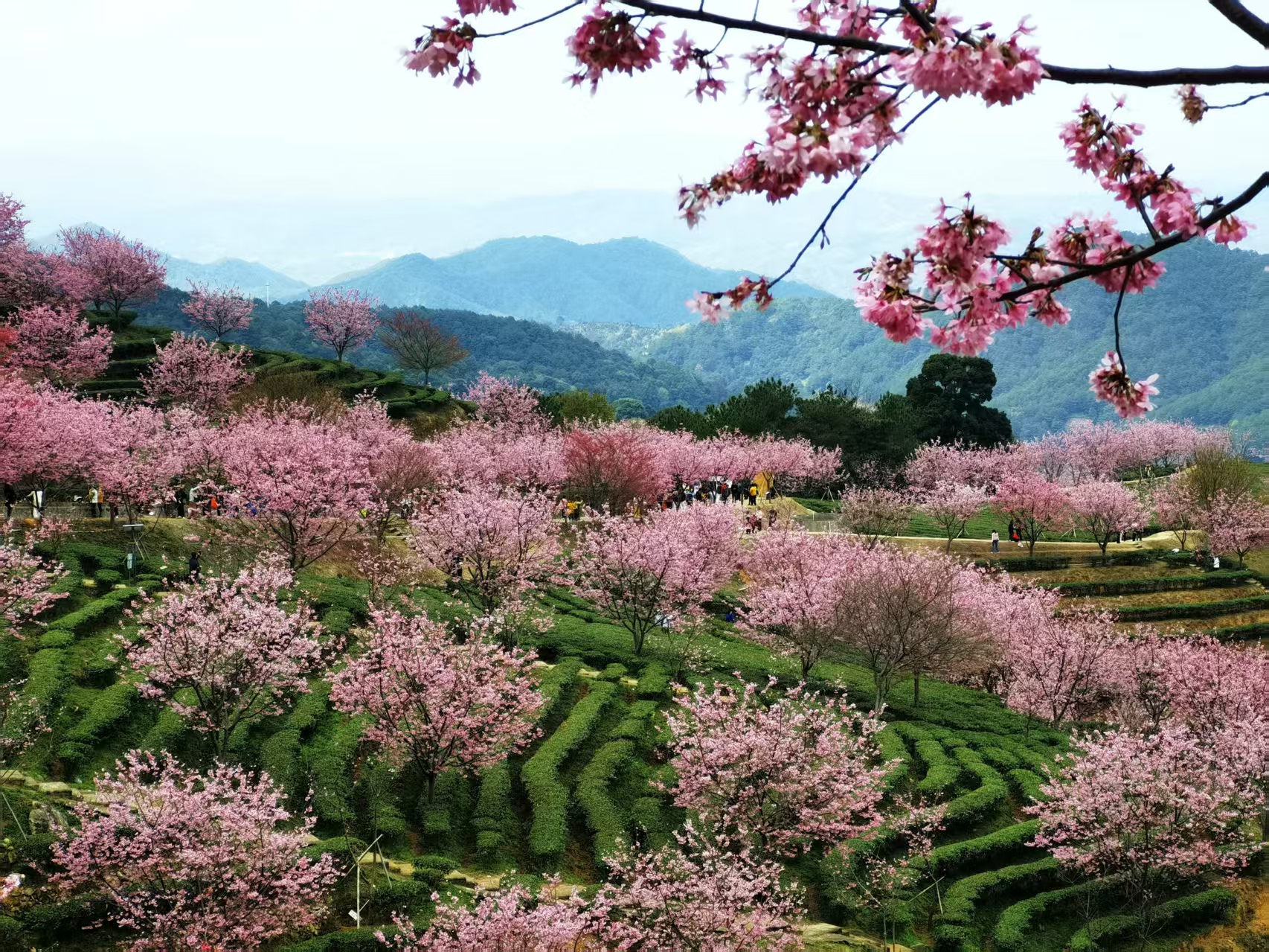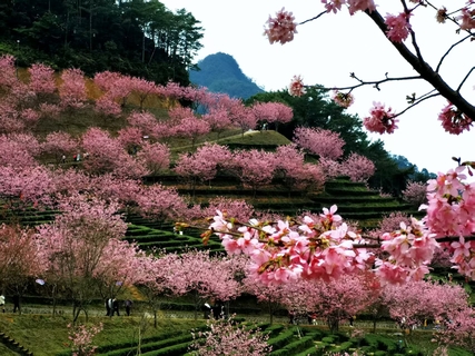 从高空俯瞰,翠绿茶垄与如云似霞的樱花交织,构成一幅动人的山水画卷,被誉为“岭南赏樱第一山”。