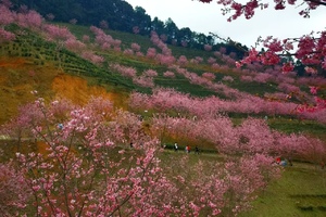 阴那山的春日,是一场茶田与樱花的浪漫邂逅。上千亩茶园依山势绵延,上万株樱花点缀其间,红粉佳人樱、台湾牡丹樱、香水樱等品种将山峦渲染成粉色的海洋。