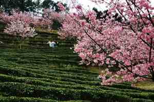 茶田樱花带:上千亩茶园中点缀着上万株红粉佳人樱、台湾牡丹樱等,形成粉色花海与翠绿茶田的壮丽景观。