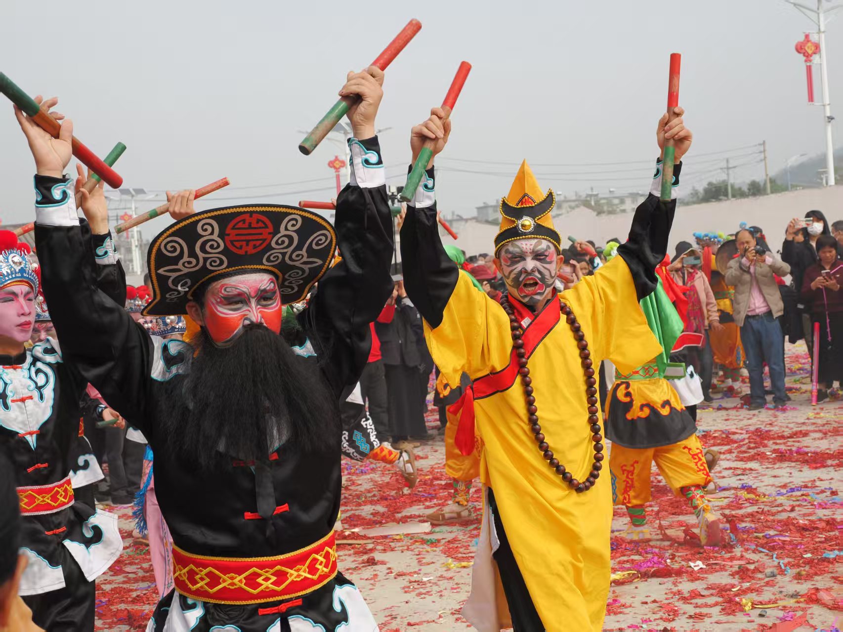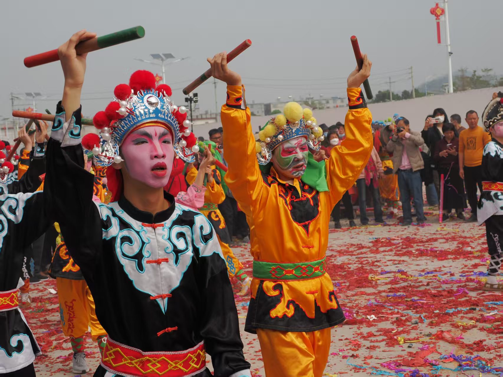 锣鼓一响,众神出巡!在普宁,用镜头见证“中华战舞”的震撼——英歌舞者们画着脸谱,手持短棍,为“老爷”开道。这是潮汕年味最浓烈的表达。