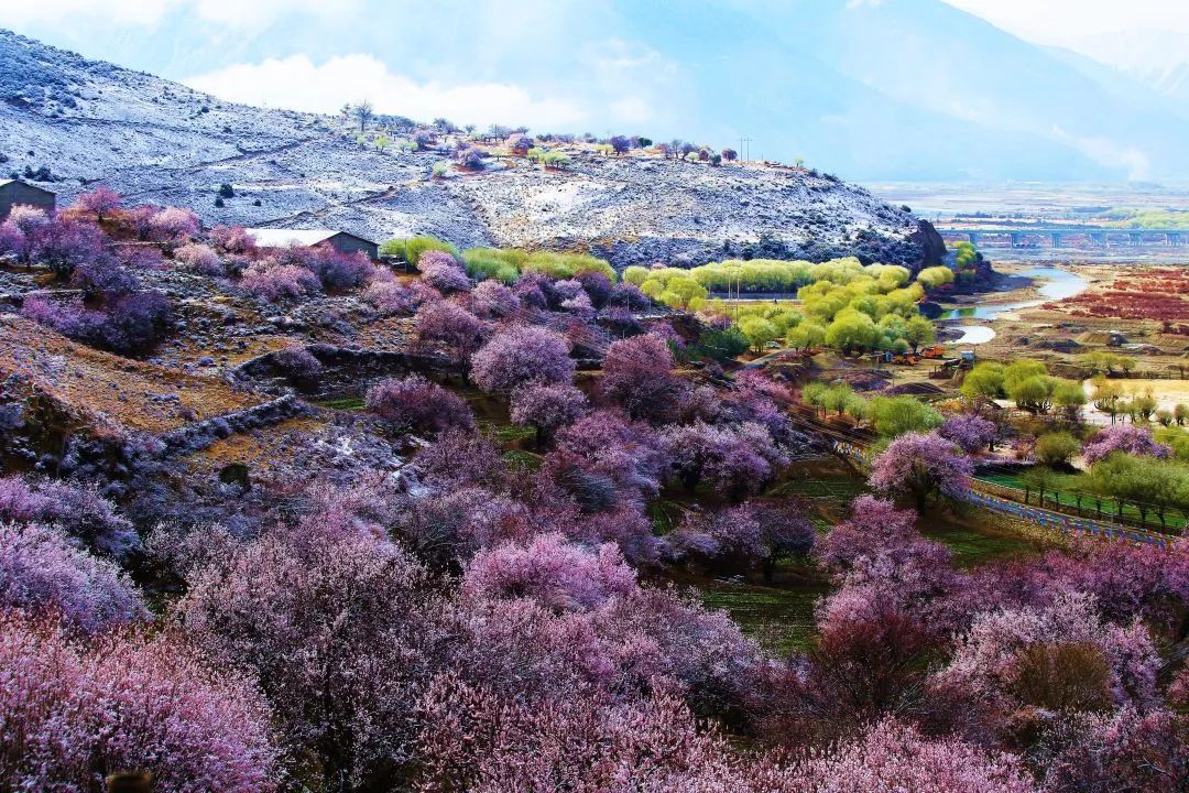位于雅鲁藏布大峡谷北岸的索松村,是观赏桃花与南迦巴瓦峰同框的绝佳位置。村庄直面海拔7782米的南迦巴瓦峰,每到春季,百年桃树绽出的花海与雪山、碧水共绘绝美画卷。这里的桃树自然分布,没有规律可循,您可以在桃树下静坐,抬头便是皑皑雪山与满眼的青绿,感受“诗意栖居”的真谛。
