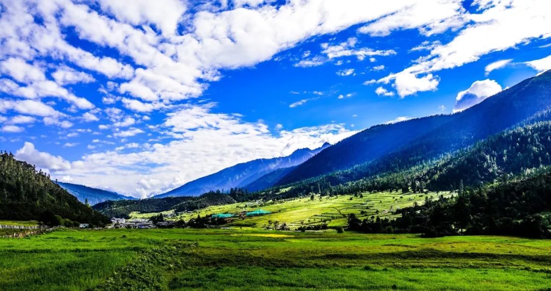 两侧青山由低往高分别由灌木丛和茂密的云杉和松树组成"鲁朗林海";中间是整齐划一的草甸,犹如人工整治一般。