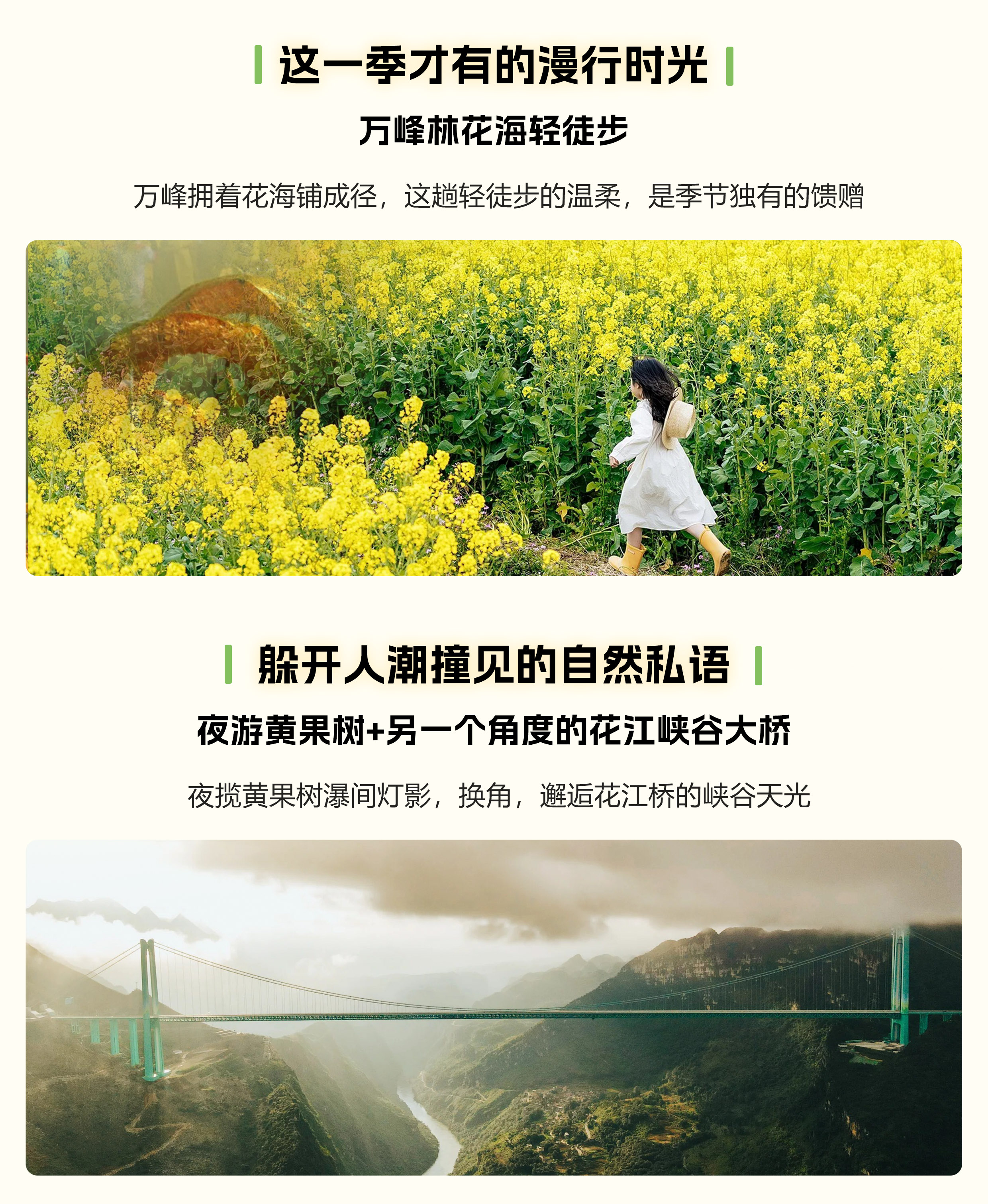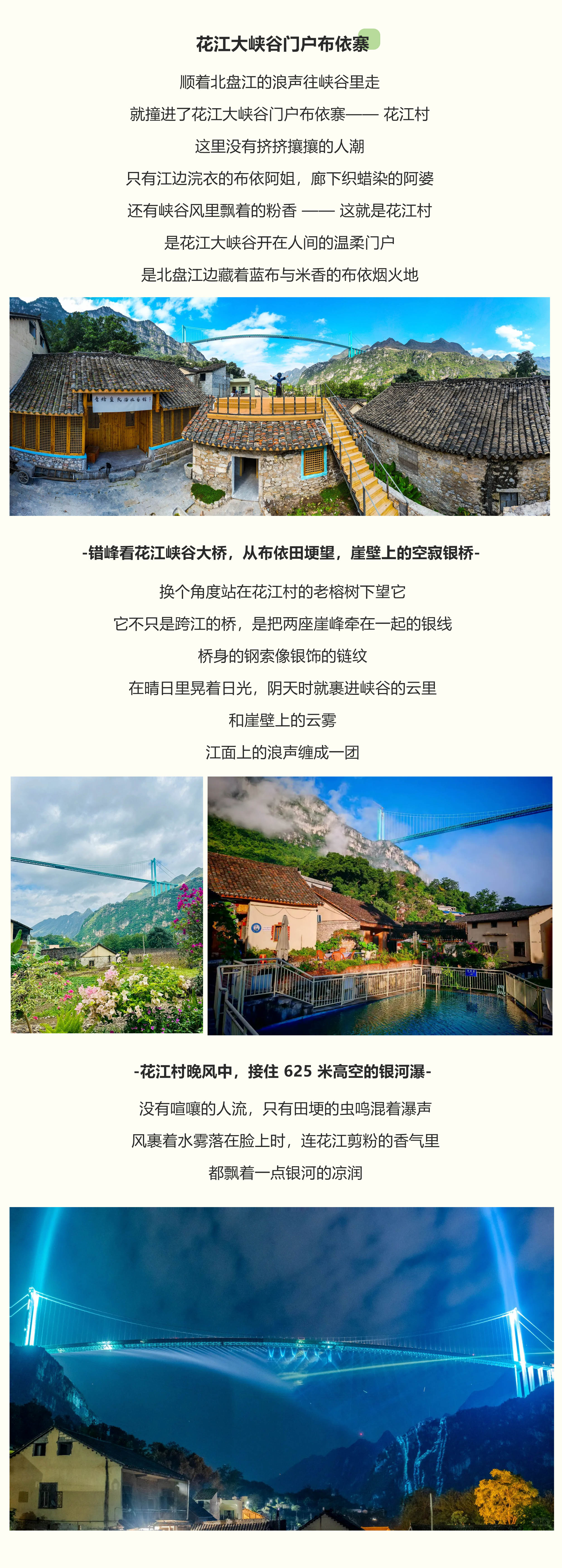走进花江村,首先映入眼帘的是依山傍水的布依村寨,青瓦灰墙的民居与绿水青山融为一体。可先前往花江铁索桥,参观红军阻击战遗址陈列馆,了解那段红色历史。接着漫步茶马古道,感受当年马帮的繁华。然后欣赏两岸的摩崖石刻,领略古人的书法艺术和文化底蕴。如果赶上传统节庆,还能观看八音坐唱、铜鼓舞等布依文化表演,体验浓郁的民族风情。此外,花江峡谷大桥也是必打卡点,感受到这座“世界第一高桥”的雄伟壮观。