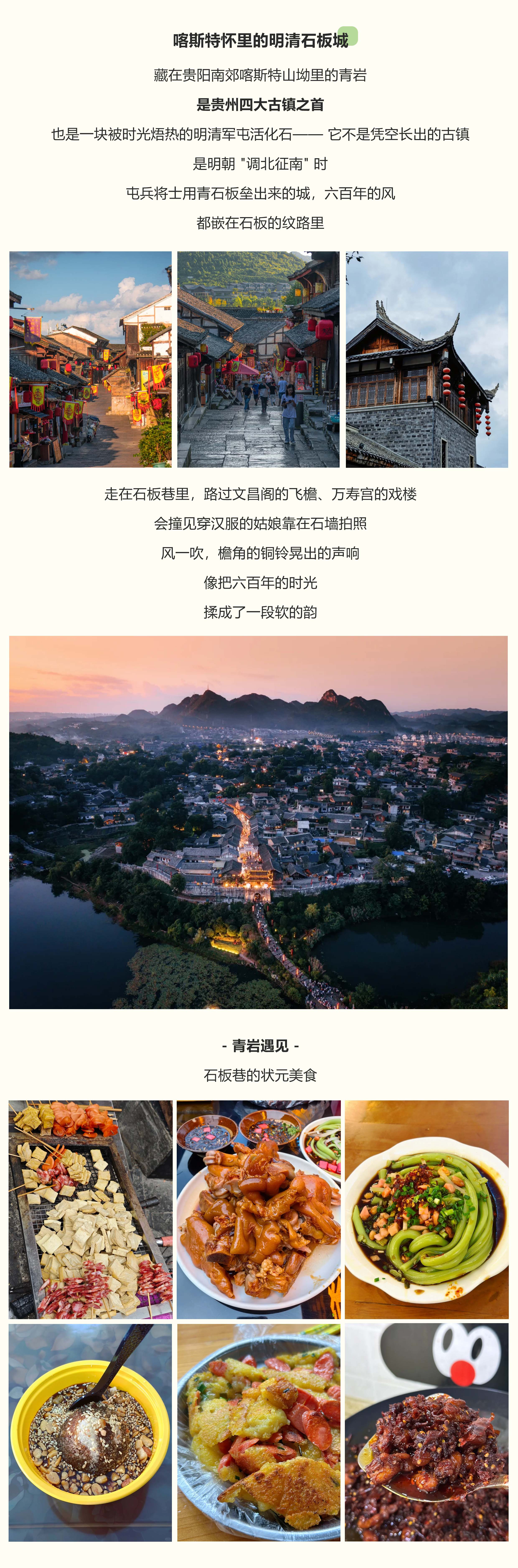 青岩古镇建于明洪武十一年(1378年),至今有六百多年历史,素有“南部要塞”之称。它原为军事屯堡,后逐渐发展为军民杂居的村落,历经多次扩建,土城墙改为石墙,成为易守难攻的军事重镇。古镇依山而建,街巷用石铺砌,民居多为石砌围墙、木柱木板结构,屋面是青石片瓦和青色布瓦,沿袭明、清建筑风格。走进青岩古镇,仿佛踏入了历史的长河。沿着青石铺就的街巷前行,两旁是古色古香的明清建筑。漫步背街,触摸古老的石墙,感受岁月的痕迹。再登上定广门,俯瞰古镇全貌和周边的山水风光。游玩过程中,别忘了品尝当地的特色美食,如卤猪脚、糕粑稀饭、豆腐圆子等。