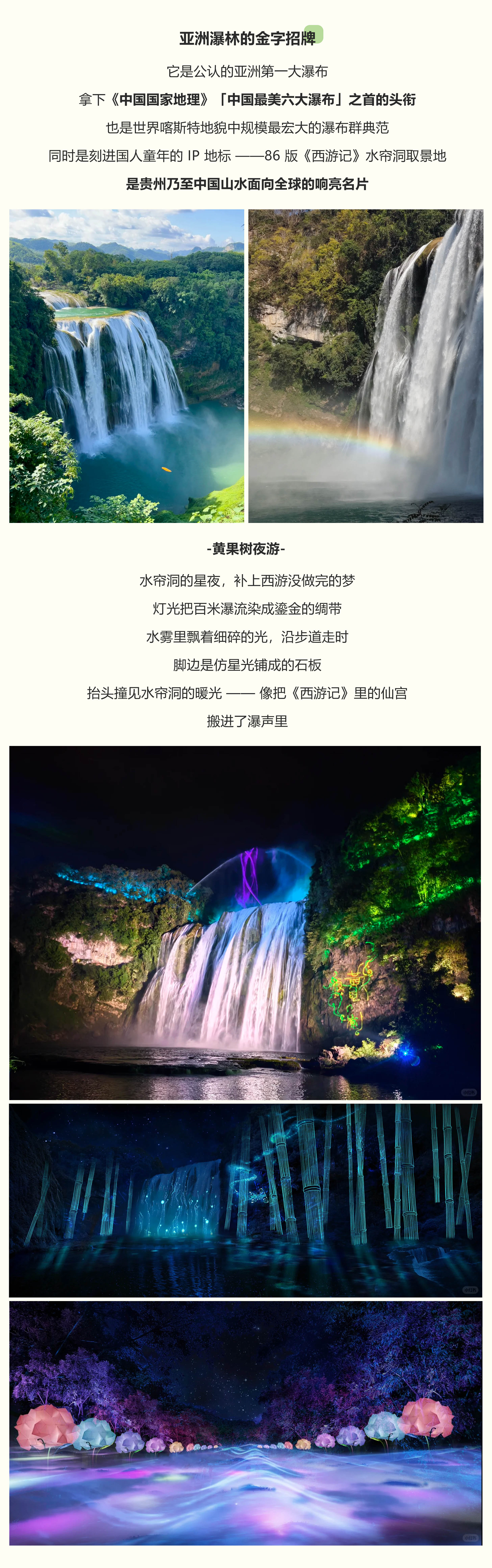 下午乘车前往【黄果树景区】夜游黄果树大瀑布核心体验,便是目睹亚洲第一大瀑布在夜幕下的华丽变身。当夕阳最后一抹余晖散去,77.8米高的瀑布开始披上光影的华服。