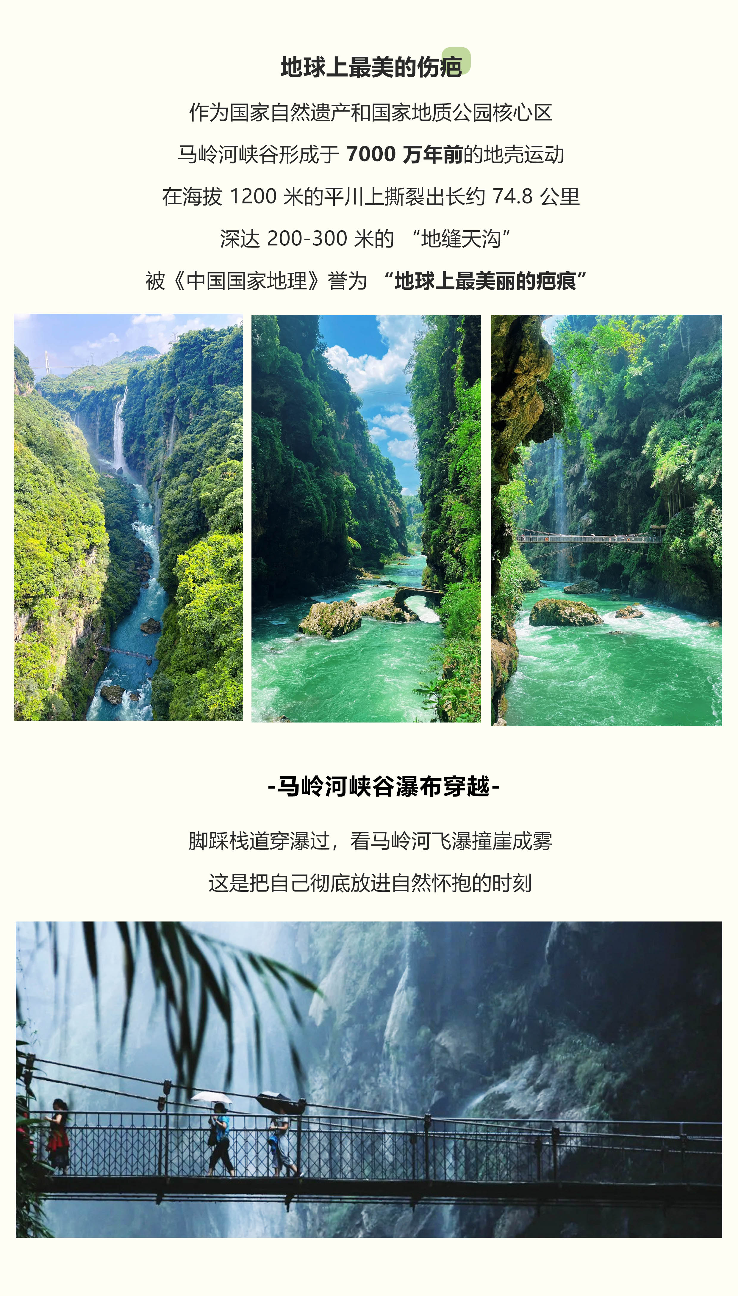 早餐后将前往【马岭河峡谷】这里被喻为“地球上最美丽的疤痕”。如果用地质学的手术刀去解刨,可见喀斯特多层次的地貌一一地缝、峡谷、瀑布、河流和碳酸钙壁挂。马岭河峡谷长约15公里,是喀斯特多层次地貌景观的典型代表,以地缝嶂谷、群瀑悬练、钙华壁挂而著名,《中国国家地理》将之列为中国瀑布最多的峡谷。峡谷中间有两座吊桥,我们将沿着谷底的古驿道徒步游览,路瀑布相伴,经过落差大、规模大的瀑布,耳边便轰隆作响,水流自顶峰极速奔腾,如怒潮狂涌。伴着震耳欲聋的水声,飞瀑中喷溅出来的小水珠细如烟尘弥漫于空气之中,清凉感随之而来,水汽氤氲间让人仿若处于仙境。
