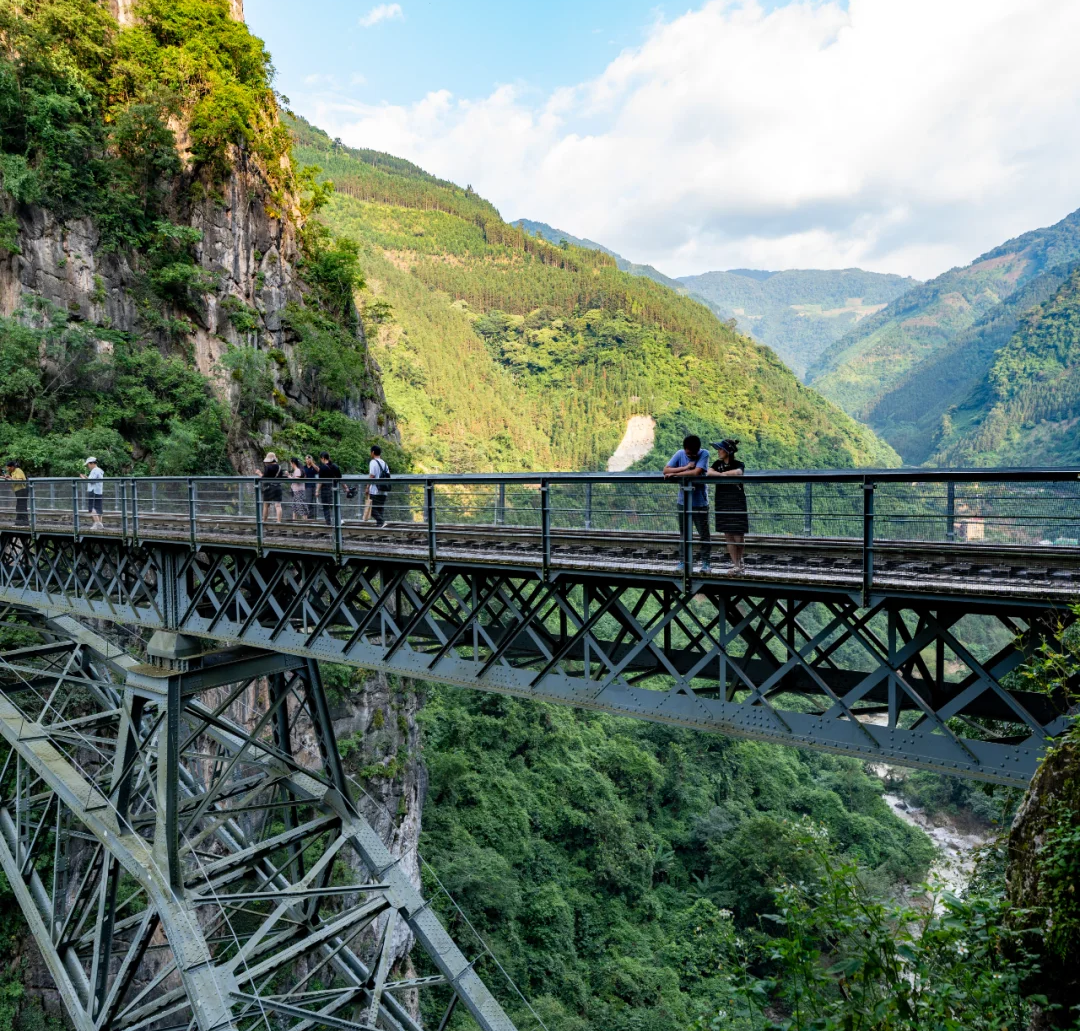 随后沿着国道,途径大片荔枝园后,来到【人字桥村】,我们来一段滇越铁路的【轻徒步体验】,沿着铁轨前行几百米,穿过山洞,近距离的来到桥边,这是800余名中国劳工血泪建成的已经沿用了100多年的的人类奇迹—【人字桥】。运气好,还能看到经过桥上的运输货物的货运火车。看完桥以后就返回下来谷底,沿着峡谷栈道,从另外一个角度还可以看到它的全景风貌。