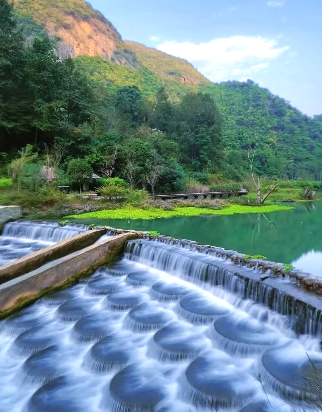 我们返程到【滴水苗城】,独特且统一的苗式建筑,让人一进入牛角寨门后就从视觉上体验到当地的苗族文化,这里山水相依,四季常青,水坝形成瀑布景观,是拍照打卡的绝佳地点。