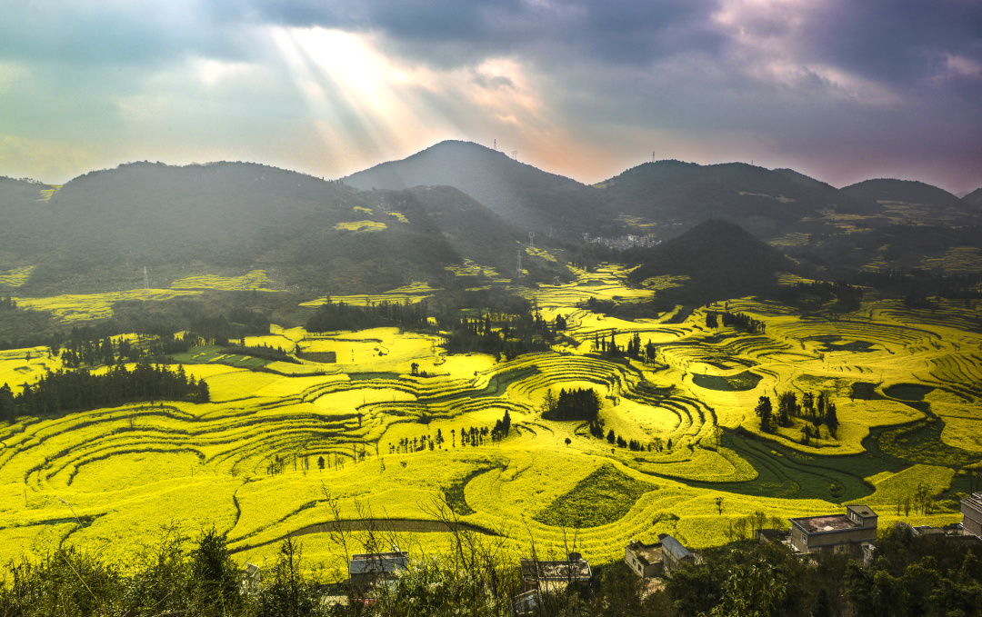 玩后前往罗平【金鸡峰从】,此处地方比较灵活,大家可以分开游玩,金鸡峰可以在附近山头拍照,也可租电瓶车或自行车前往更深入的地方看花海。春天的罗平满眼都是金灿灿的黄,几十万亩油菜花满山遍野地开放,非常充裕的时间留给您尽情拍照,还特意为您准备了特色民族服装让您尽情地放飞自我凹造型!天气好可以拍摄到耶稣光射到云雾中若隐若现的油菜花以及金鸡峰群。日落后我们前往罗平县城入住。