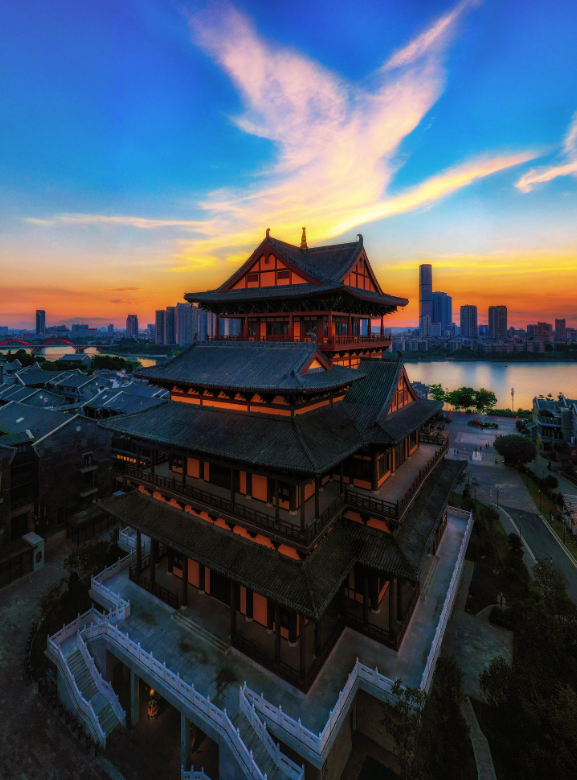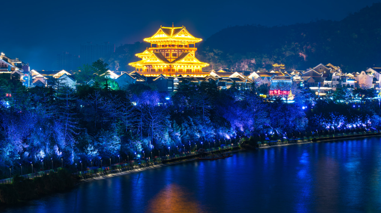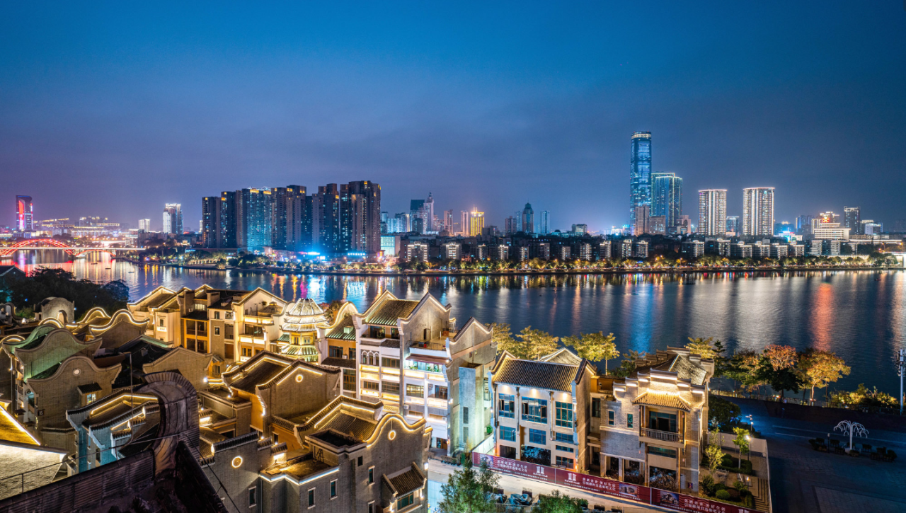两岸霓虹闪烁,高楼倒映在波光粼粼的江面,宛如一幅流动的画卷。窑埠古镇的灯火、蟠龙山的倩影、音乐喷泉的绚烂,交织成一场视觉与心灵的双重盛宴。