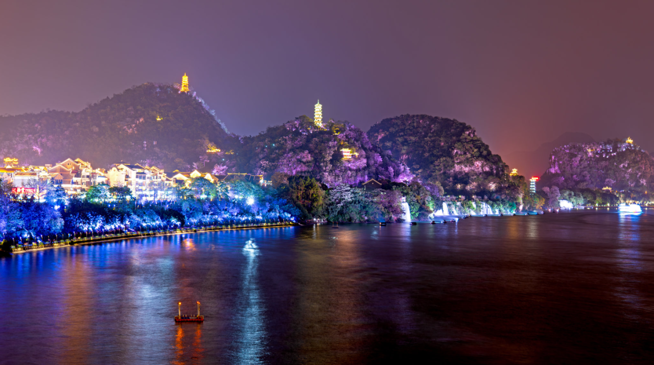 当夜幕降临,柳江两岸华灯初上,百里柳江化身为一条流光溢彩的丝带,蜿蜒穿城而过。乘上游船,迎着江风,感受柳州夜晚的独特魅力。