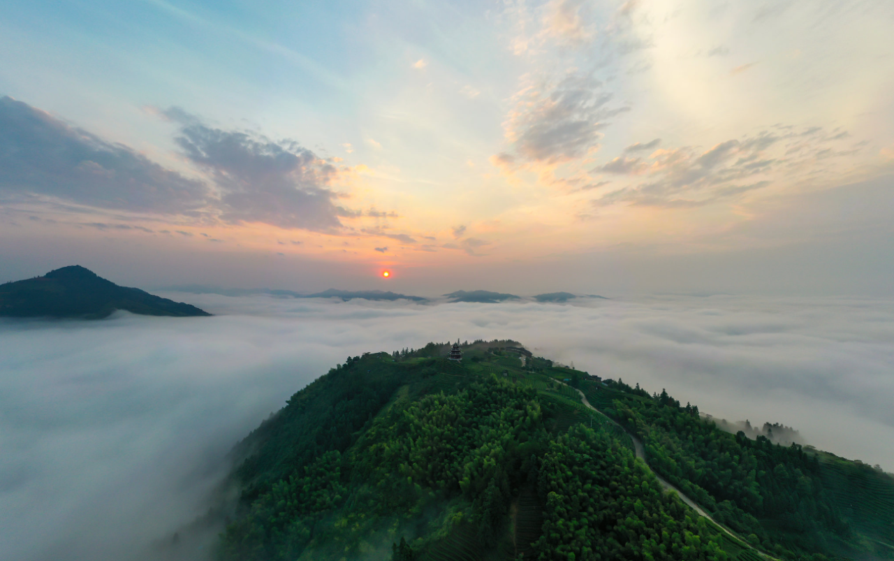 布央仙人山位于广西柳州市三江侗族自治县,以壮丽的梯田茶园和云雾缭绕的自然风光闻名。这里是优质茶叶的产地,茶园层层叠叠,宛如仙境。游客可体验采茶、品茶,感受侗族茶文化,同时欣赏日出云海的绝美景色,是休闲度假与亲近自然的理想之地。
